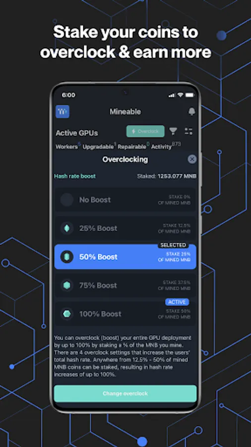 • Stake your $MNB to overclock your GPU and boost your rewards