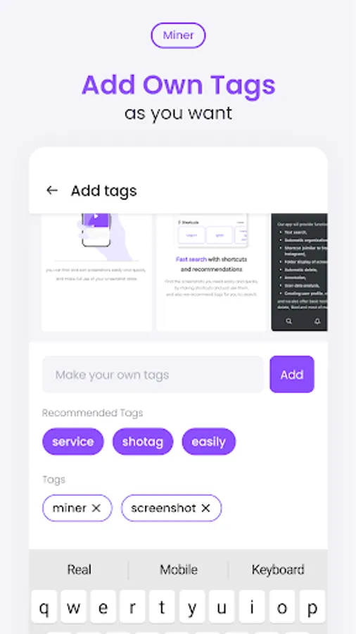 -Categorizing with Tag. Not just finding only one image, you can also organize a group of screenshots with tags.