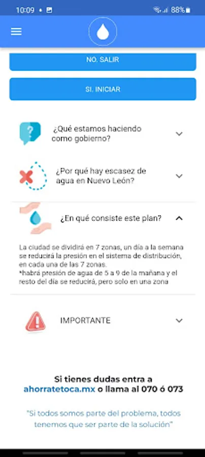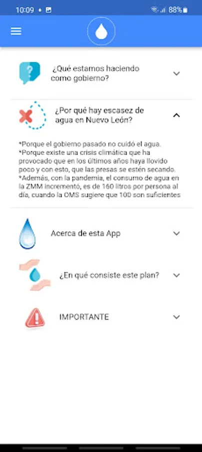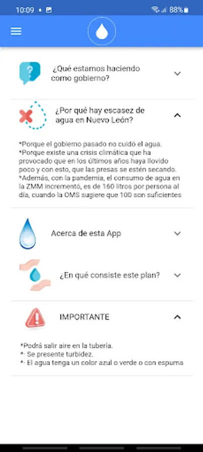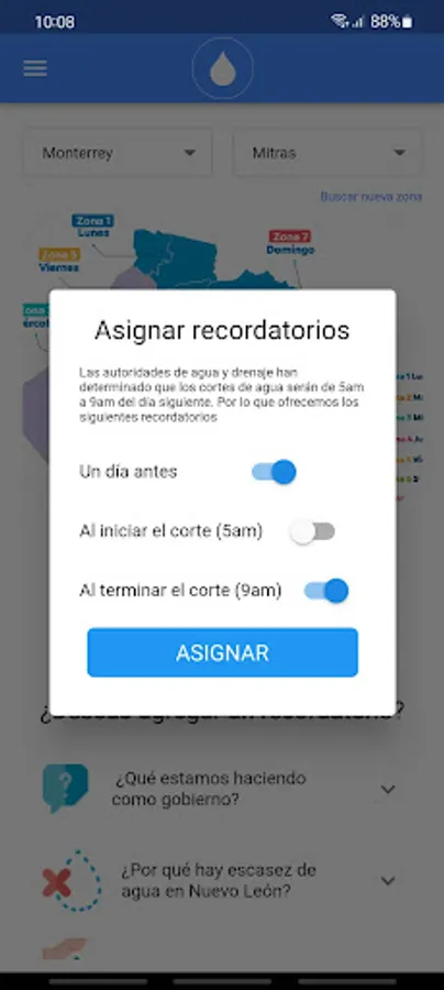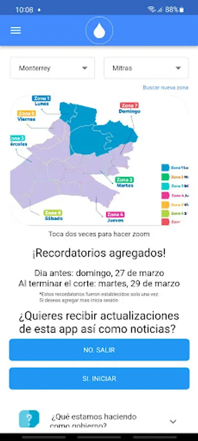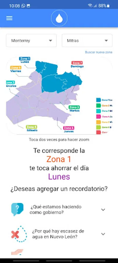 App external to the government of Nuevo León where we help you identify your area and provide you with a reminder of scheduled water cuts in the state. Let's save water and make a change in Nuevo León.