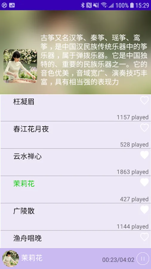 There are all kinds of famous songs such as Gaoshan Liushui, Erquan Yingyue, Guangling San, Liang Zhu, etc. All songs are free, download them and listen.