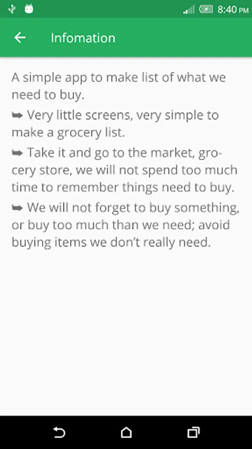 ⇒ We will not forget to buy something, or buy too much than we need. Need to Buy - Grocery List will make our grocery shopping quick and efficient.