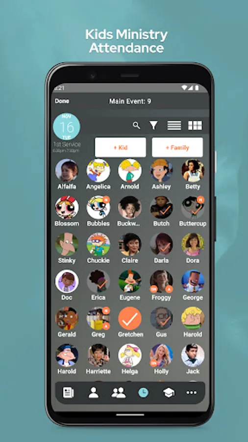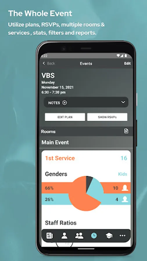Take attendance at every ministry gathering with separate tracking for each room and each service. View quick stats including gender breakdown and staff to student ratios for each service.