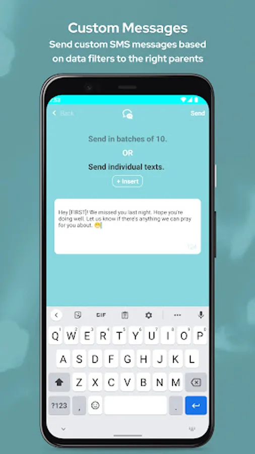 • Send individual texts to parents with personalized messages or group texts utilizing your own phone number.