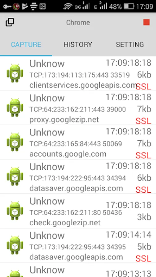 Sniffer simulates a VPN in order to capture the network traffic without root. It does not use a remote VPN server. All the data is processed locally on the device.