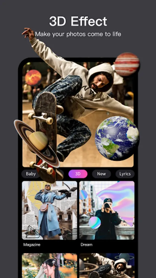 You can try tons of amazing effects which will make your photos come alive. Vakie also provides cartoon templates with different themes and effects, simply upload your picture to get started! With only one click, you will get a cool video with effects, transitions, titles and stickers!