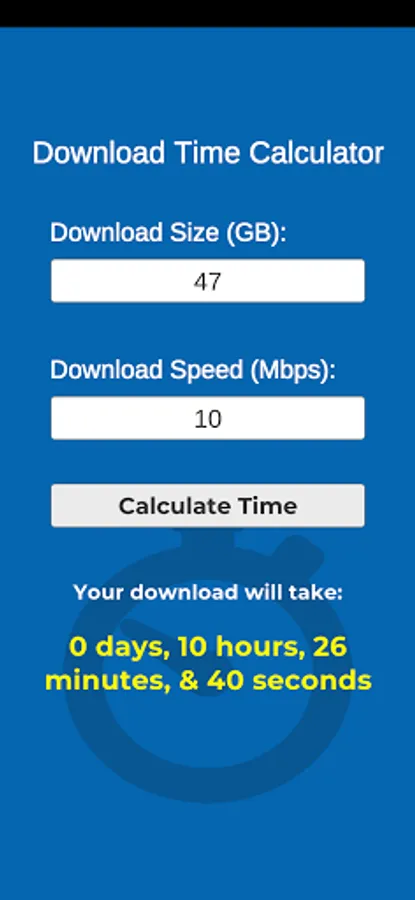 Need to work out how long it will take to download that new game? Do you need to get a big update or patch done and are wondering how long it's going to take? If so, then download this calculator now and work it out in just a few seconds.