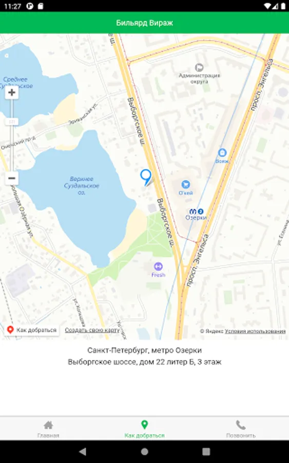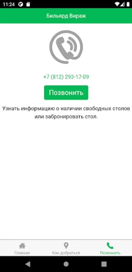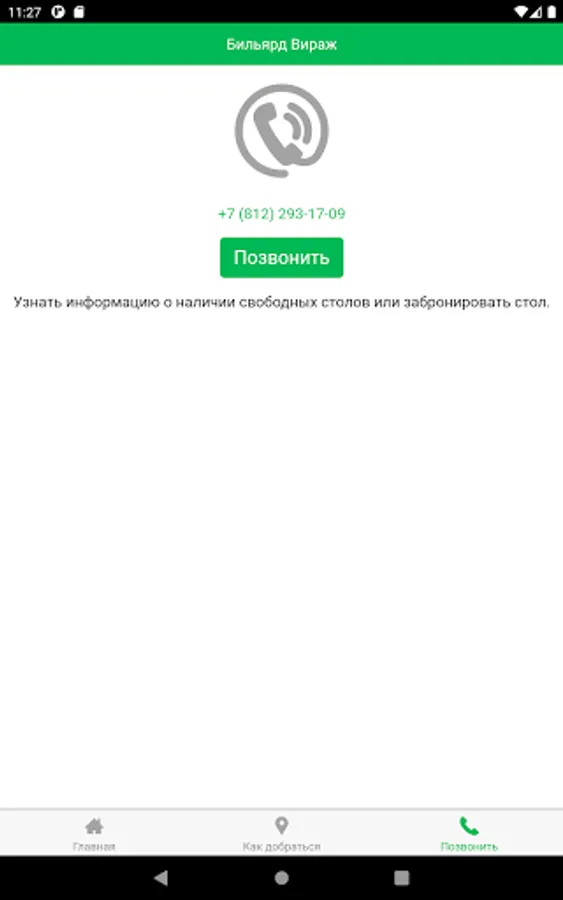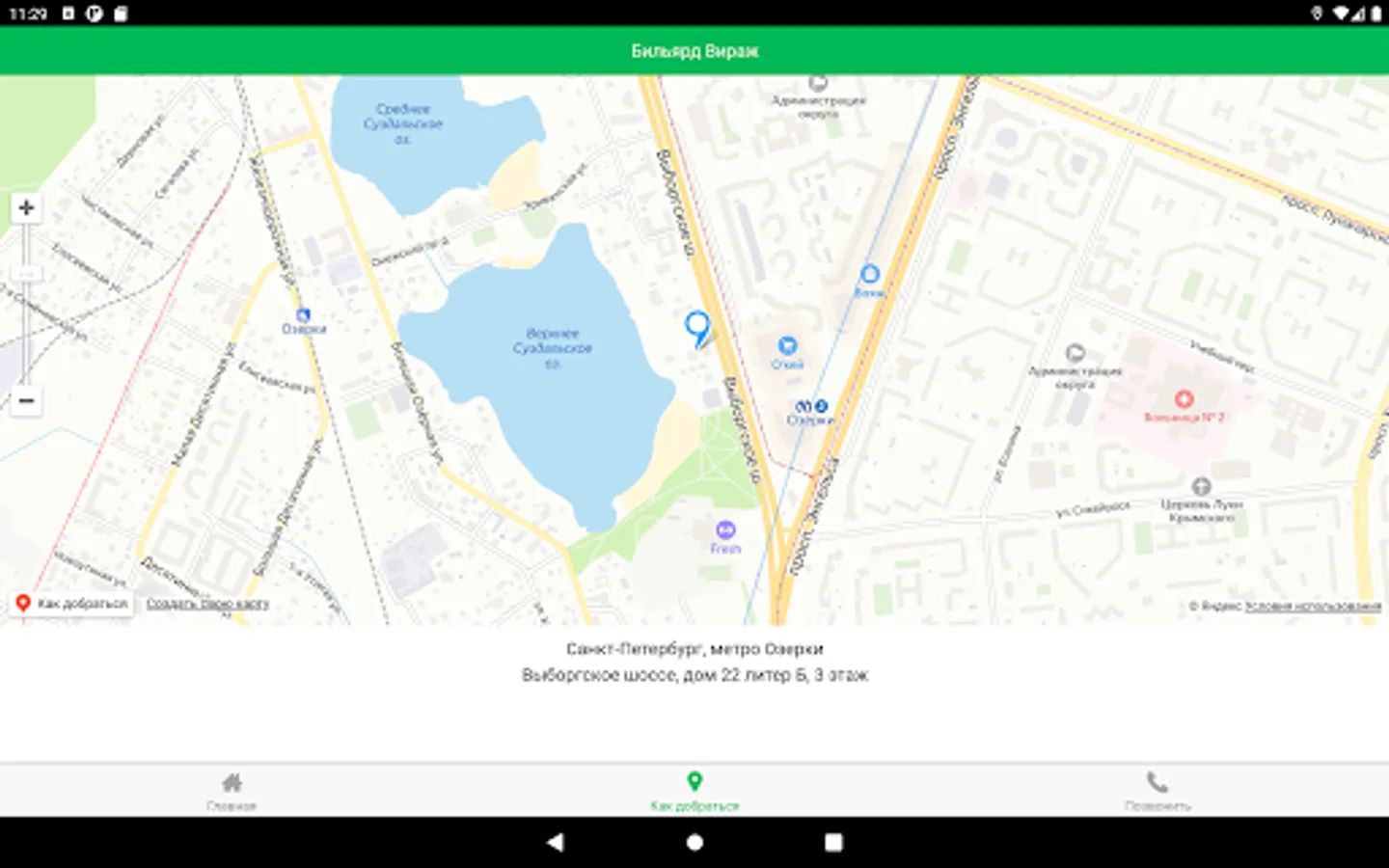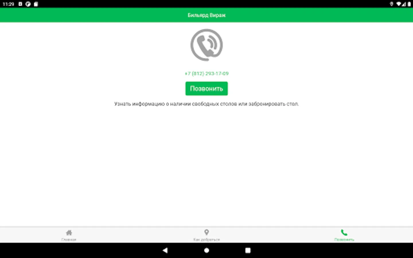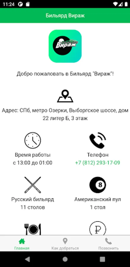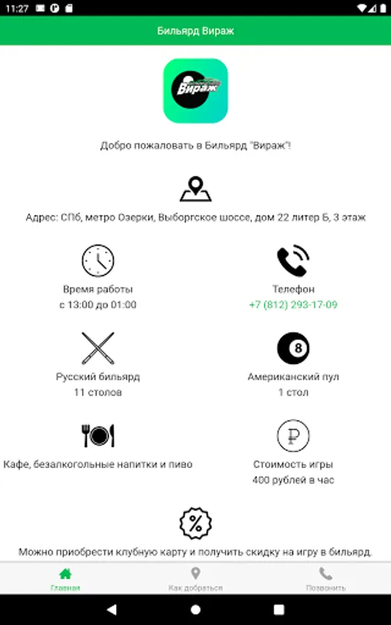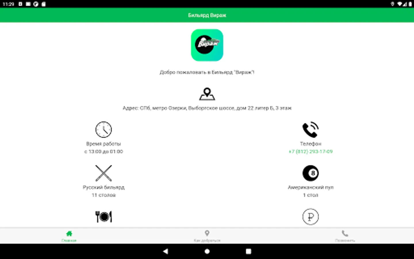 Billiards Virage application will allow you to become familiar with basic information about Virage billiards hall in St. Petersburg.