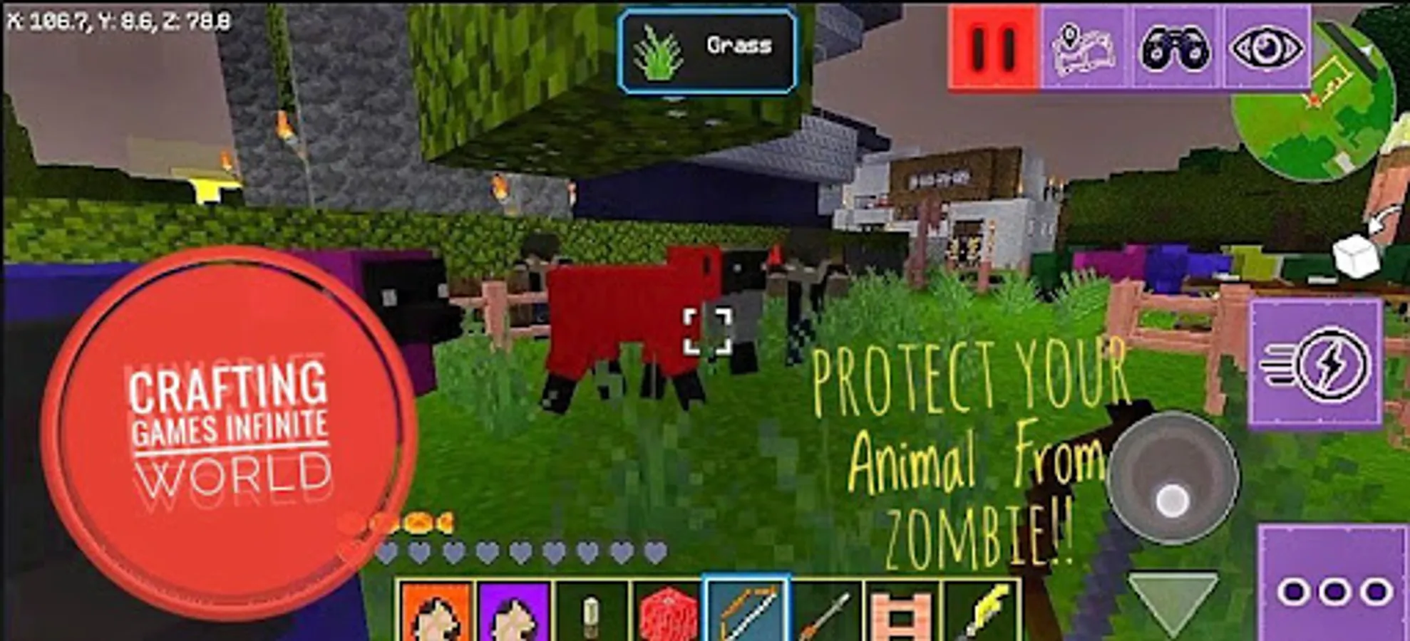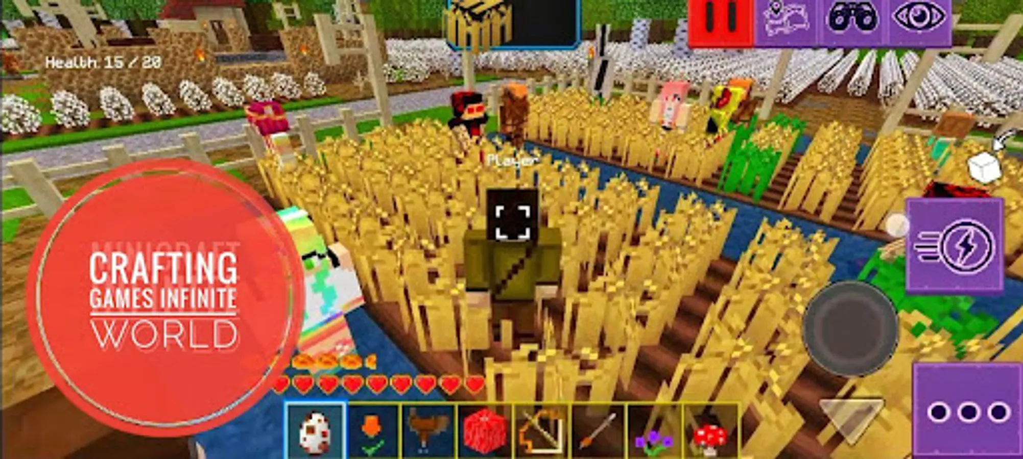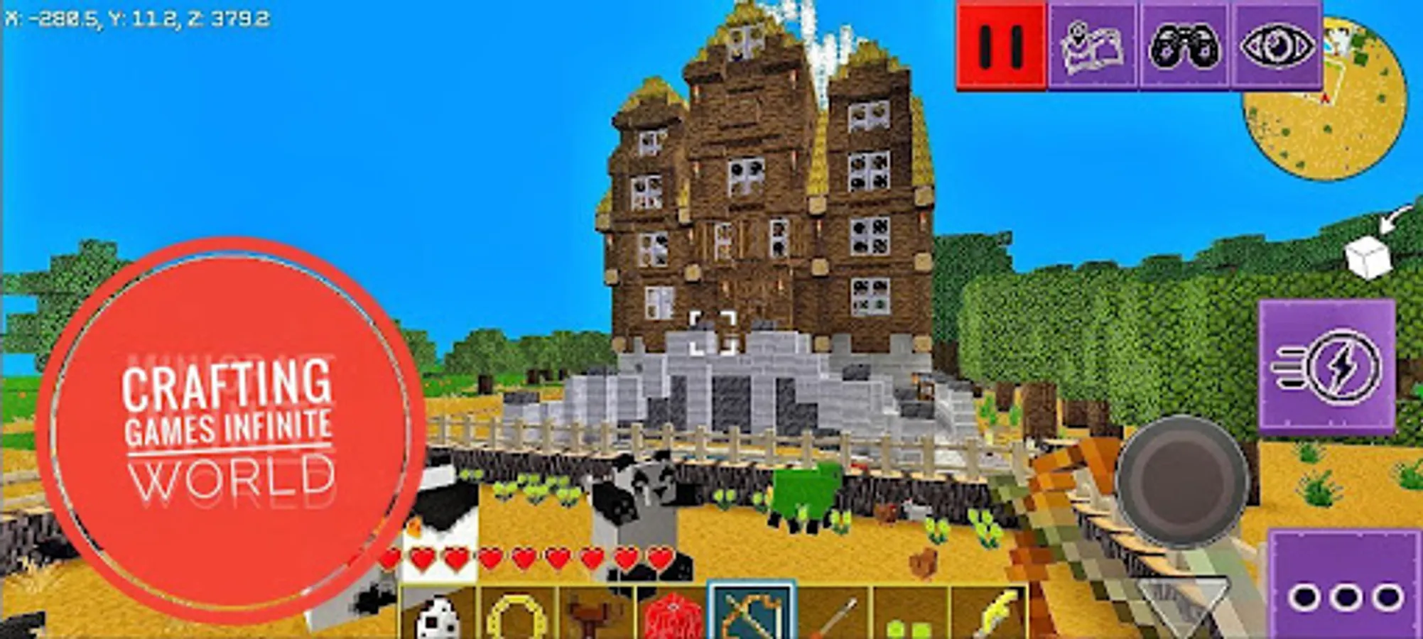 Crafting Games Infinite World is a game of building a plate on top of another plate of the same material, then a full block of the same material will be created. You can build from your imagination, from building small buildings by arranging blocks with the same materials as building a house and adding other blocks as variations to beautify the building you want, you can also build a simple farm by planting wheat, corn, cotton. You can also keep dogs and cats. You can build a sheep and cattle farm on the land you want, build a fence around your farm and give your livestock food such as wheat so they can produce food supplies. This game can be played offline, with a calm and beautiful texture so that the world you create will not bore you