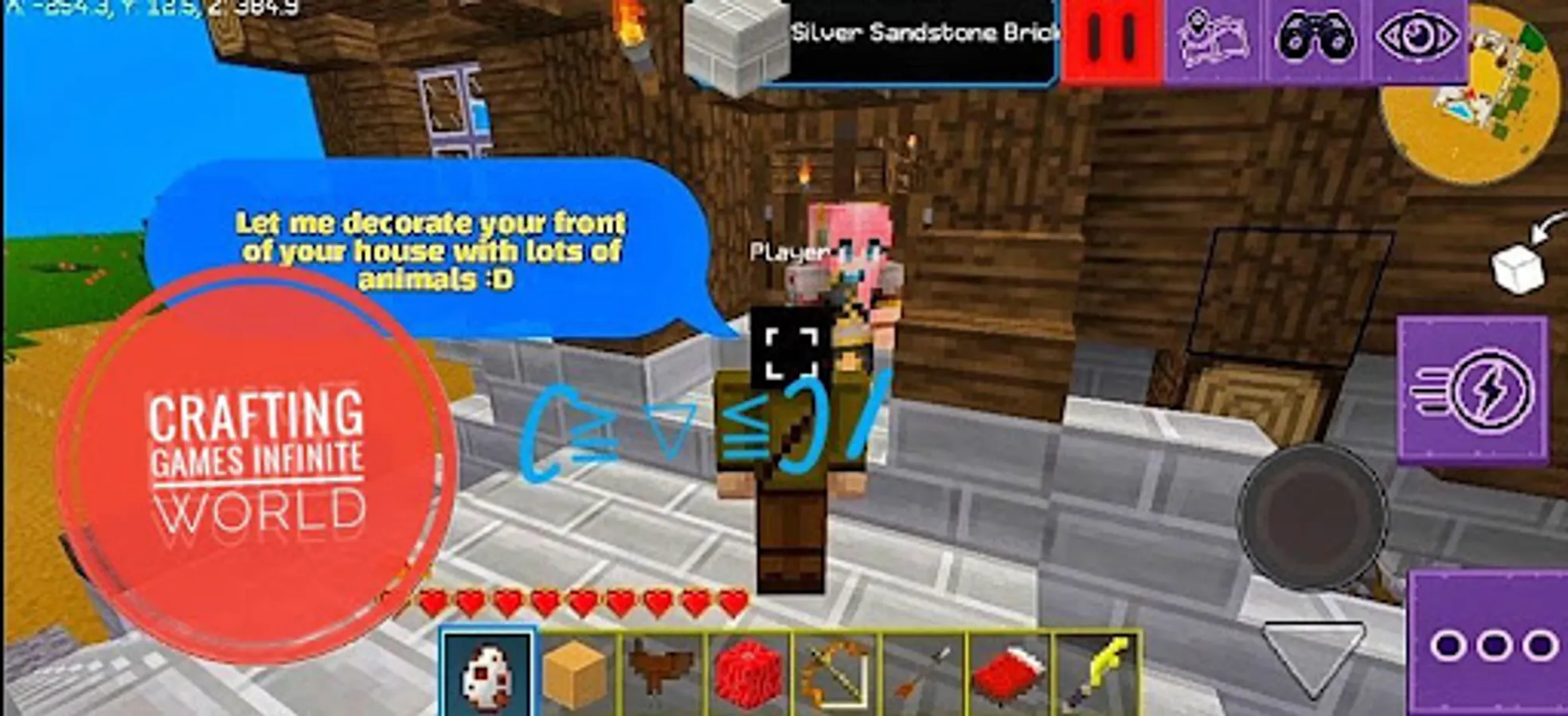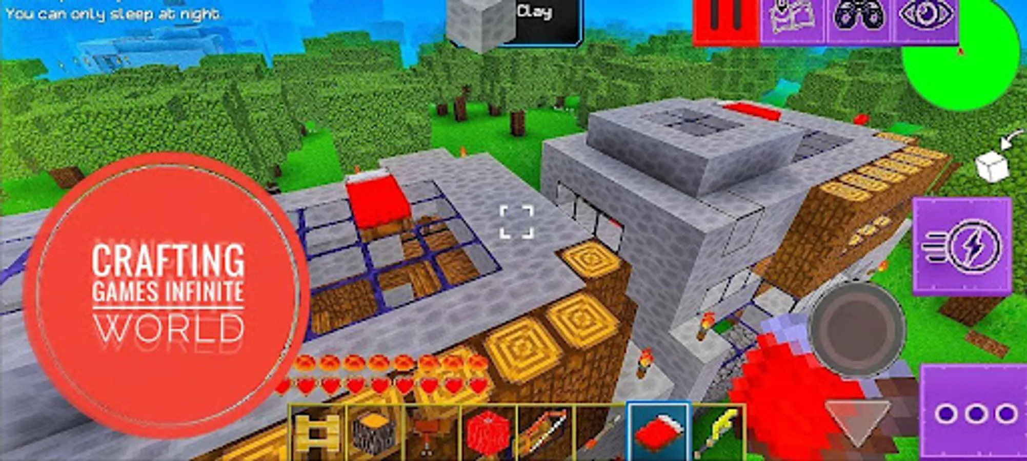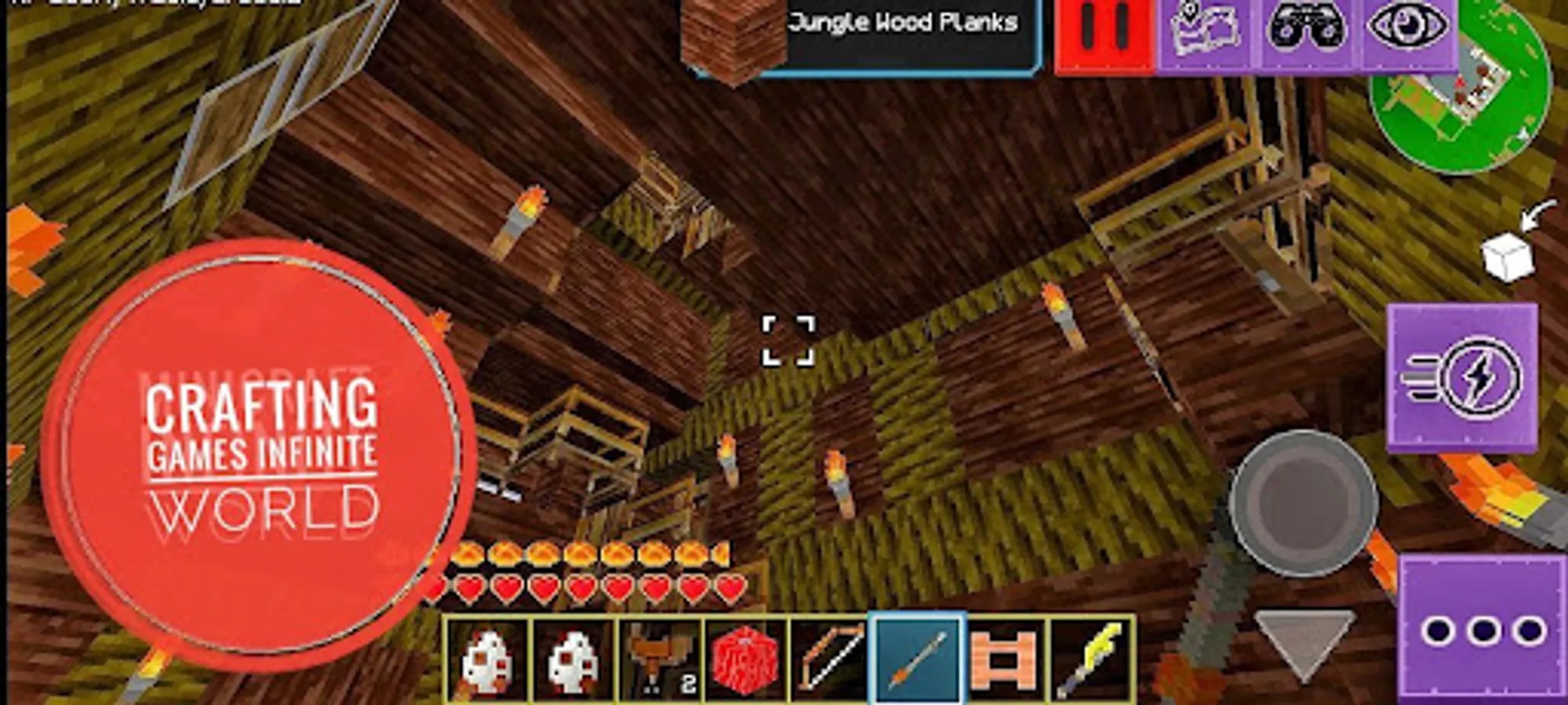 Crafting Games Infinite World is a game of building a plate on top of another plate of the same material, then a full block of the same material will be created. You can build from your imagination, from building small buildings by arranging blocks with the same materials as building a house and adding other blocks as variations to beautify the building you want, you can also build a simple farm by planting wheat, corn, cotton. You can also keep dogs and cats. You can build a sheep and cattle farm on the land you want, build a fence around your farm and give your livestock food such as wheat so they can produce food supplies. This game can be played offline, with a calm and beautiful texture so that the world you create will not bore you