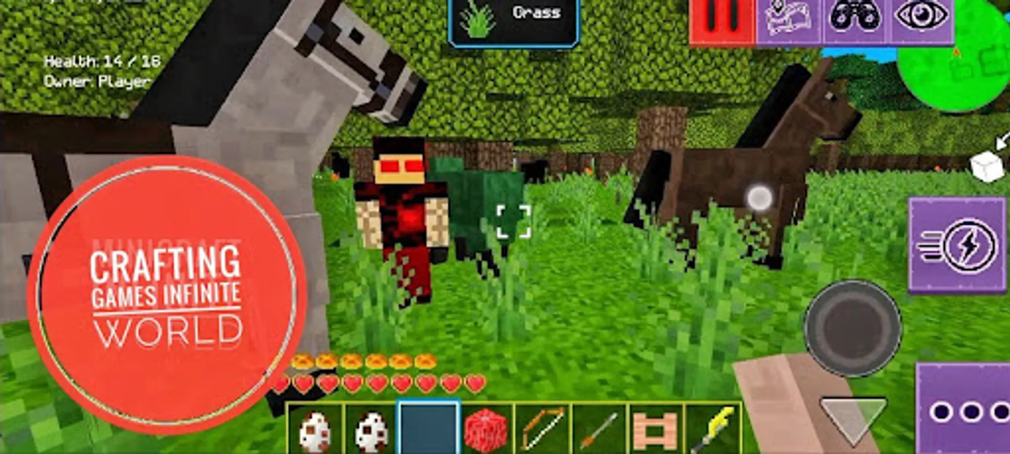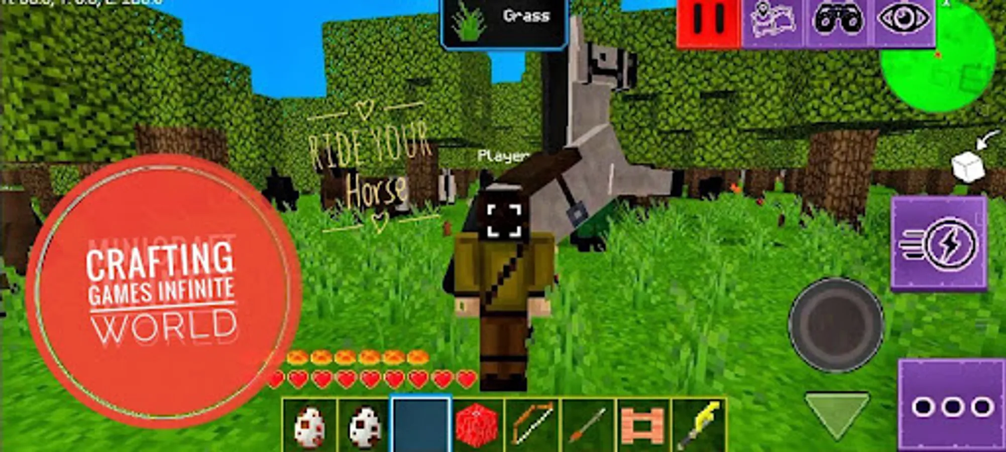 You can do horse riding in this latest Crafting Games Infinite World game, look for a horse around the grassland biome, then take the saddle in your inventory box and attach it to the horse by tapping on the horse object, then the horse is ready for you to ride.