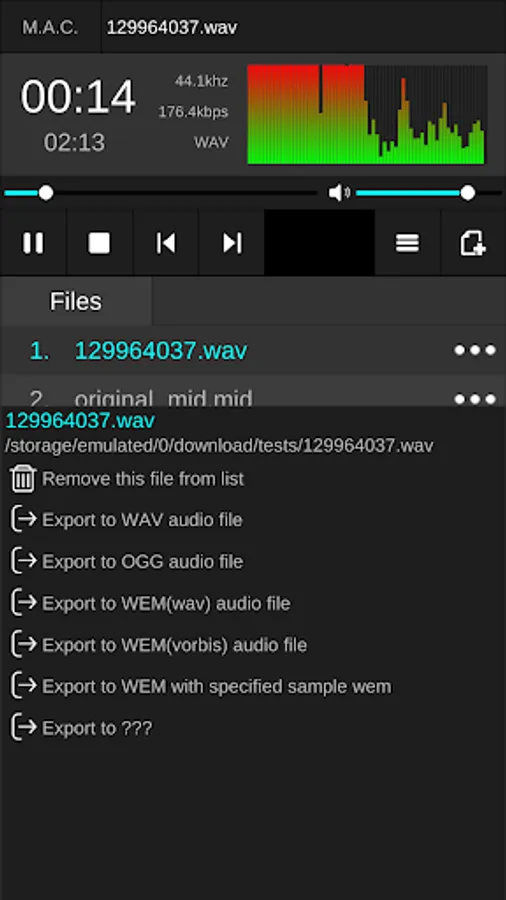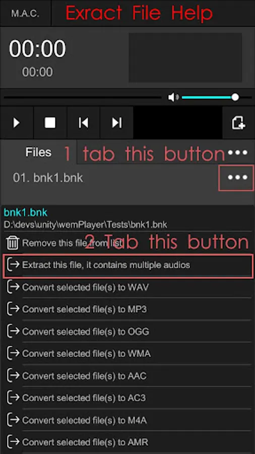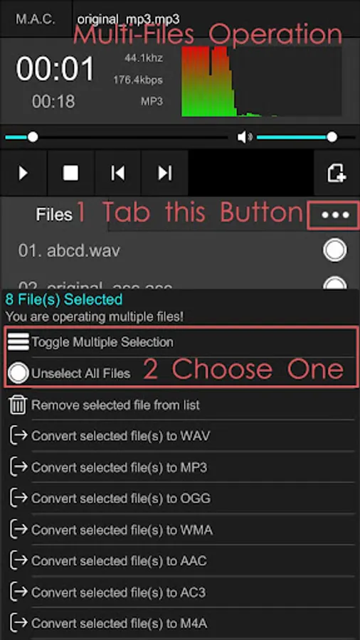 Supported Convert to Audio Formats : OGG MP3 WAV WMA ACC AC3 M4A AMR OPUS AIFF FLAC WEM etc.