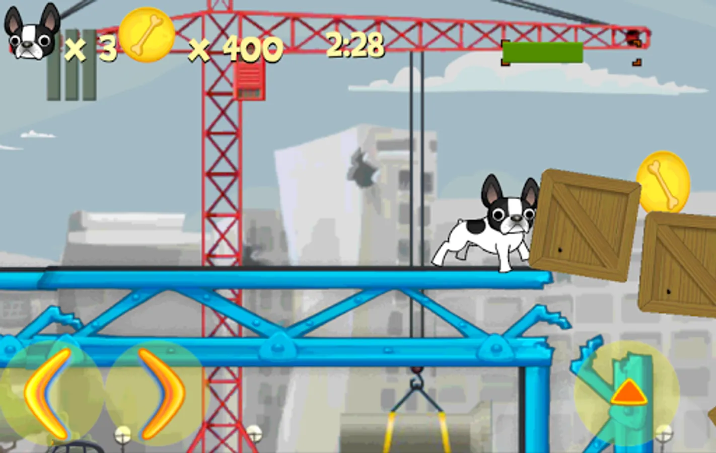 Navigate your Frenchie puppy dog through the world from left to right using the directional buttons on the left, using the jump button on the right of screen to jump over obstacles like boxes and enemies.