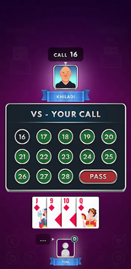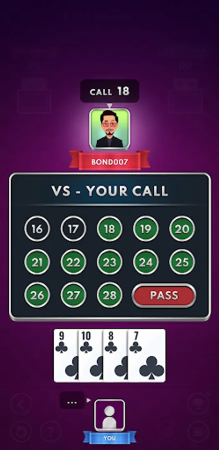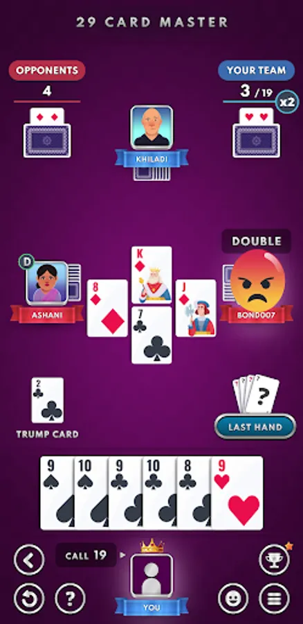 Twenty-nine or 29 (also called 28 with small changes in rules) is a very addictive and popular card game. It is played by four players in fixed partnerships. In our game, you will find all the common rules like double, re-double, full-set, pair, single hand etc. The game is played with 32 cards consisting of 8 cards from each suit. Jack (3 points), Nine (2 points), Ace (1 point) and Ten (1 point) are the only cards which have points. Thus making a total of 28 points. The players facing each other are partners.The teams need to CALL and set a target for themselves and then achieve it. The player who makes the highest CALL gets to set the trump suit thus biasing the game towards them. The opponents need to achieve 29 - (CALL) to stop the other team from winning the game. This is where the game gets its name '29'.