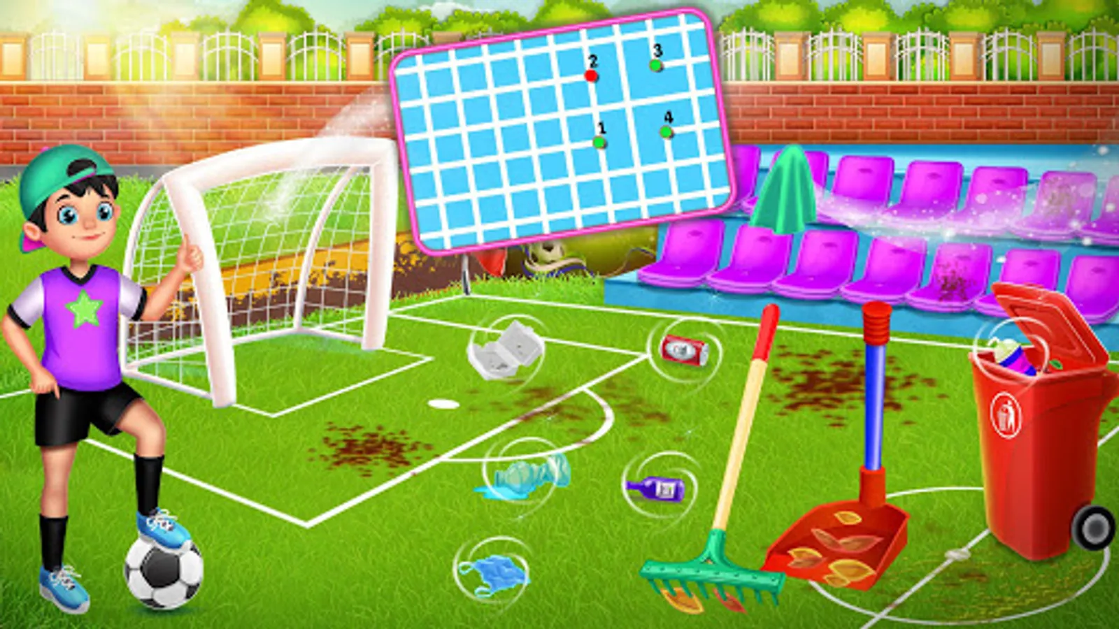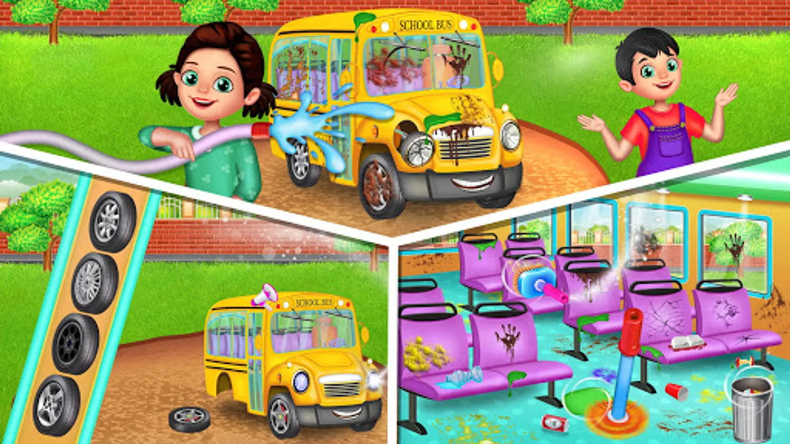 Sweet girls start the dirty and messy high school cleaning from playground park. The sports stadium is full of trash and need complete makeover. First collect the trash and dup it in the dust bin. Then repair the football goal net and fix the sitting area seats. Repair and build the swings and slides in the theme park like playing area. School bus is also looking rusty and dirty. Completely makeover the vehicle like a real car wash mechanic. Wash the bus with water, soap and sponge. Cleanup the car from interior and repair broken stuff in the school bus like best garage mechanic. You can also decorate the bus with different customization options.