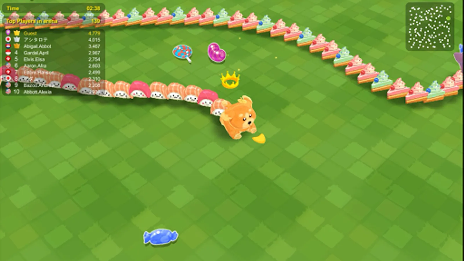 In the game, you keep hunting for various kinds of food and buffs to get higher score. Making opponents crash into your tail then swallowing their remains is the best way to grab tons of scores! Keep it up!
