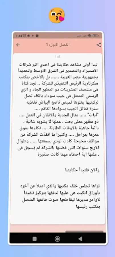 The first scenes of our story begin in one of the largest import and export companies in the Middle East, specifically in the Arab Republic of Egypt ... but especially in the office of the secretariat of the CEO of the company .. We find a girl in her mid-twenties with a serious appearance and a uniform represented in a black pocket that barely reaches her knees. On top of it is a pure white shirt covered by a jacket similar to the pocket in its dark black.... "Ayat"..... an example of seriousness and workmanship.... She has a purely practical appearance, her work is flawless, always ready in emergency times.... Her intelligence ...