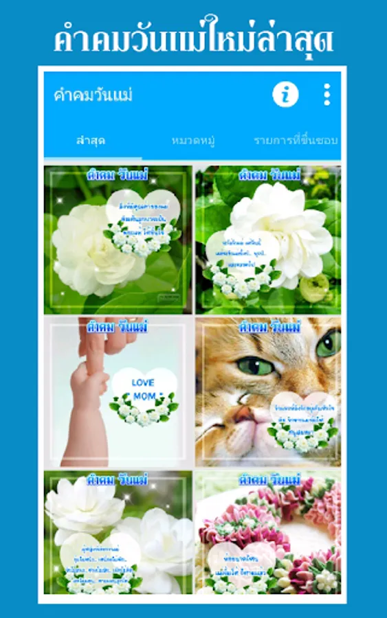 ♥ August 12, say I love my mother instead of my heart with the application, Mother's Day Quotes, Mother's Love Poems. There are many to choose from for the children to convey their love to their mother every day by sending a cute Mother's Day greeting card. Tell your mother to be happy, love sentences, good messages to show that you love your mother. Mother's Day sharp words. the most and meaningful The sharpest Mother's Day Share your feelings via Social Network. Send your love to your mother that is sweet, touching and warm.