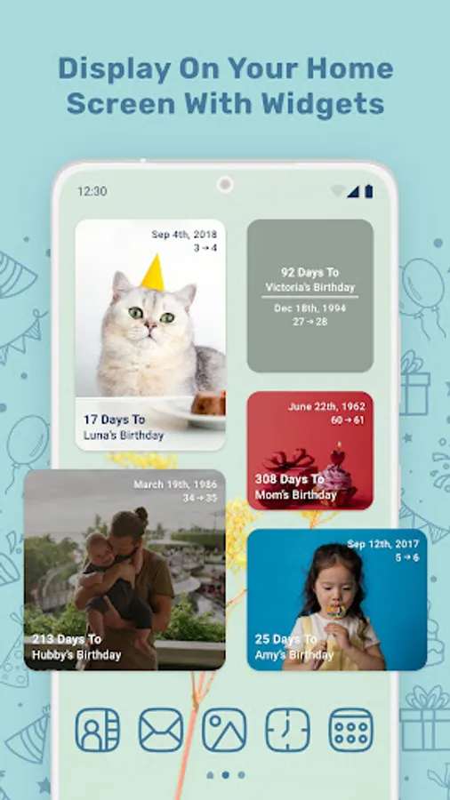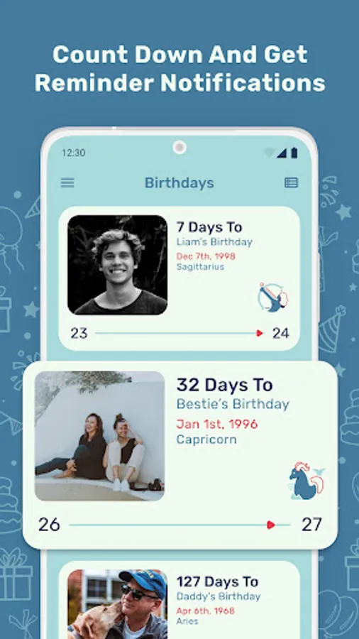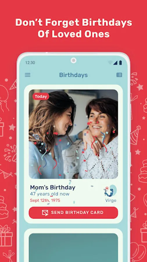 Display your birthdays with organized and pleasant way. Birth date, zodiac, age and countdown information will be displaying on the cards. You can also track your events with home screen widgets. You can create and send stylish celebration cards within seconds when the time comes!