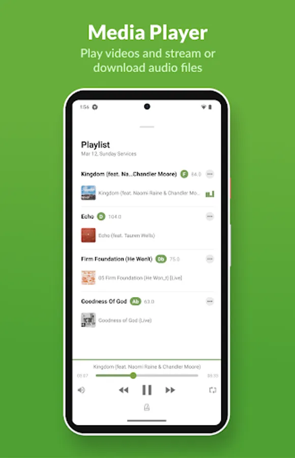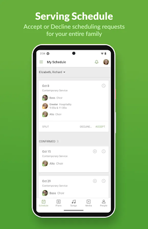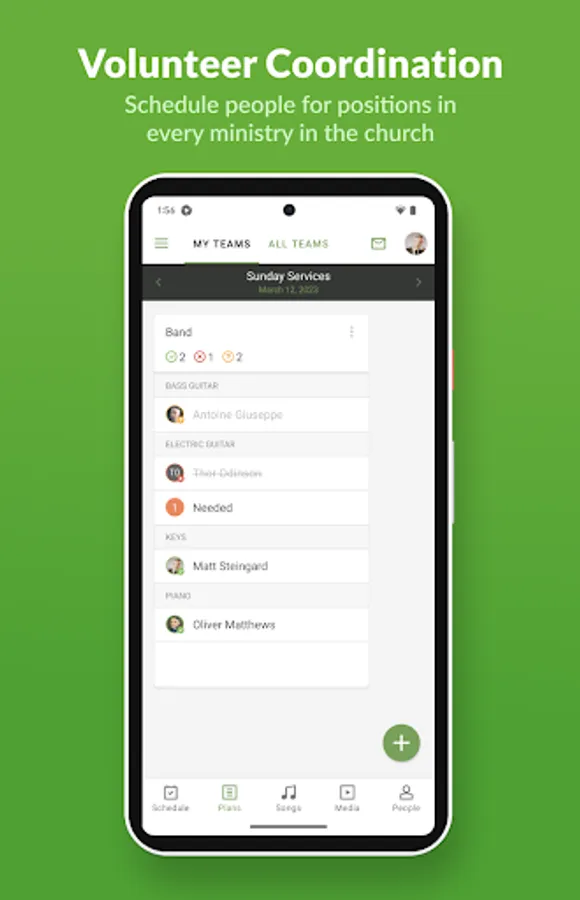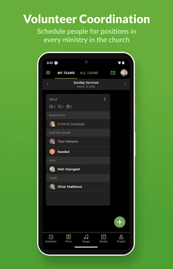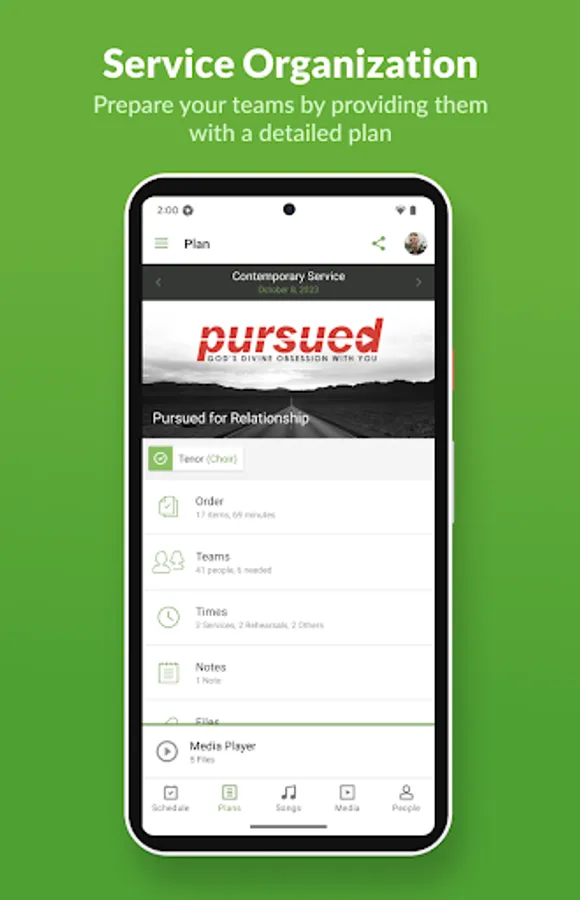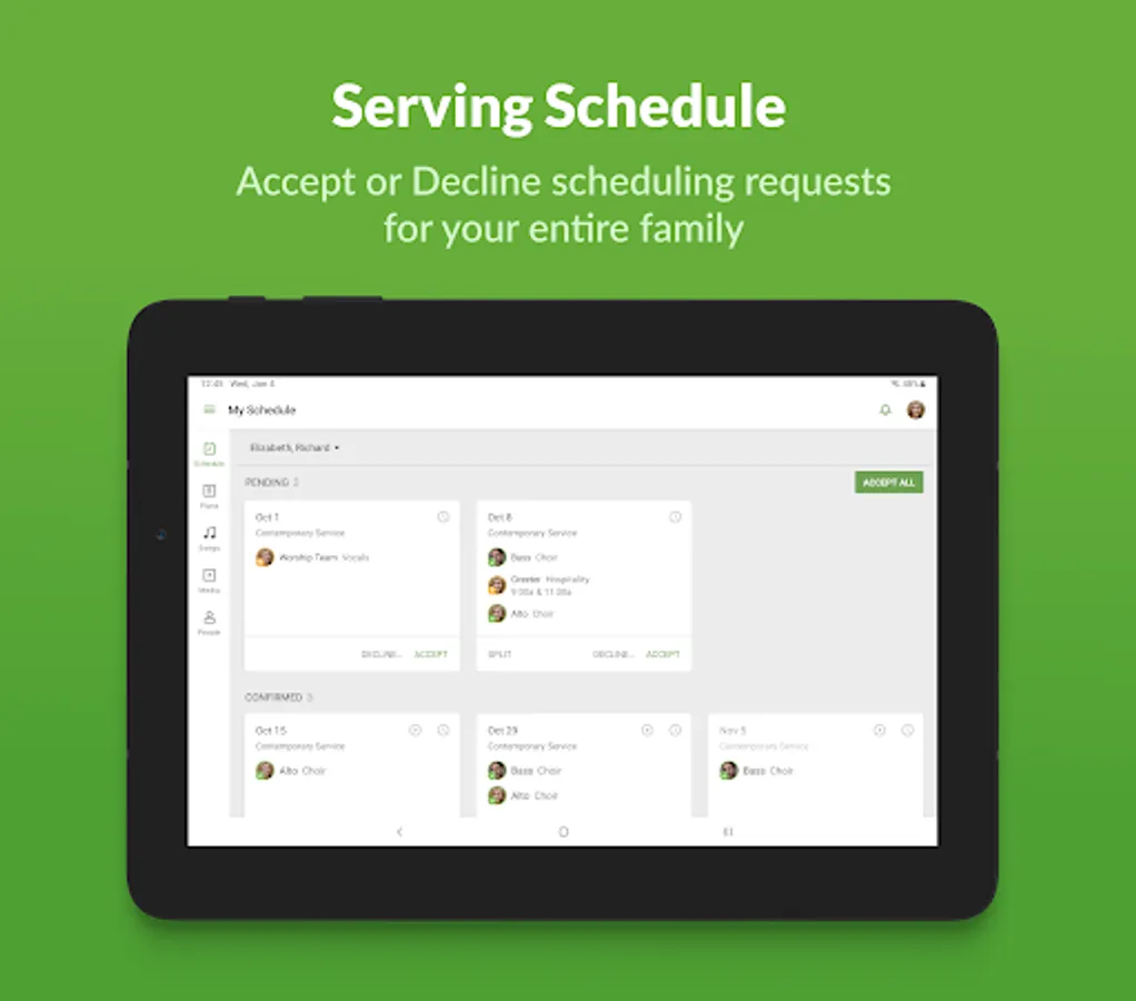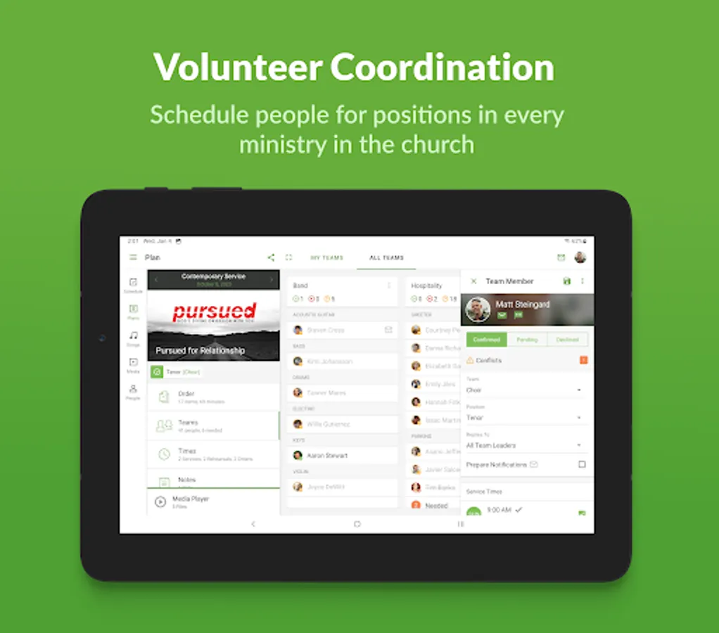 With our native Android app, you get an optimized Planning Center Services experience wherever you are! You can manage your schedule, accept or decline requests, blockout dates, or upload your profile picture. Musicians can use the built-in media player or attachments section to access and rehearse their music. Schedulers can add users to schedules, check for conflicts, and email their teams at any time. Easily add to, reorder, and edit your plans.