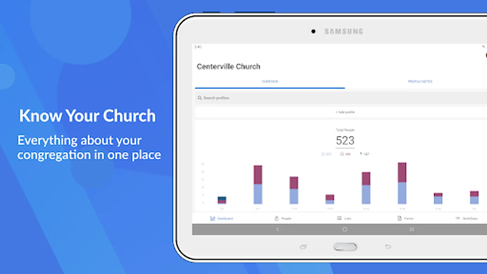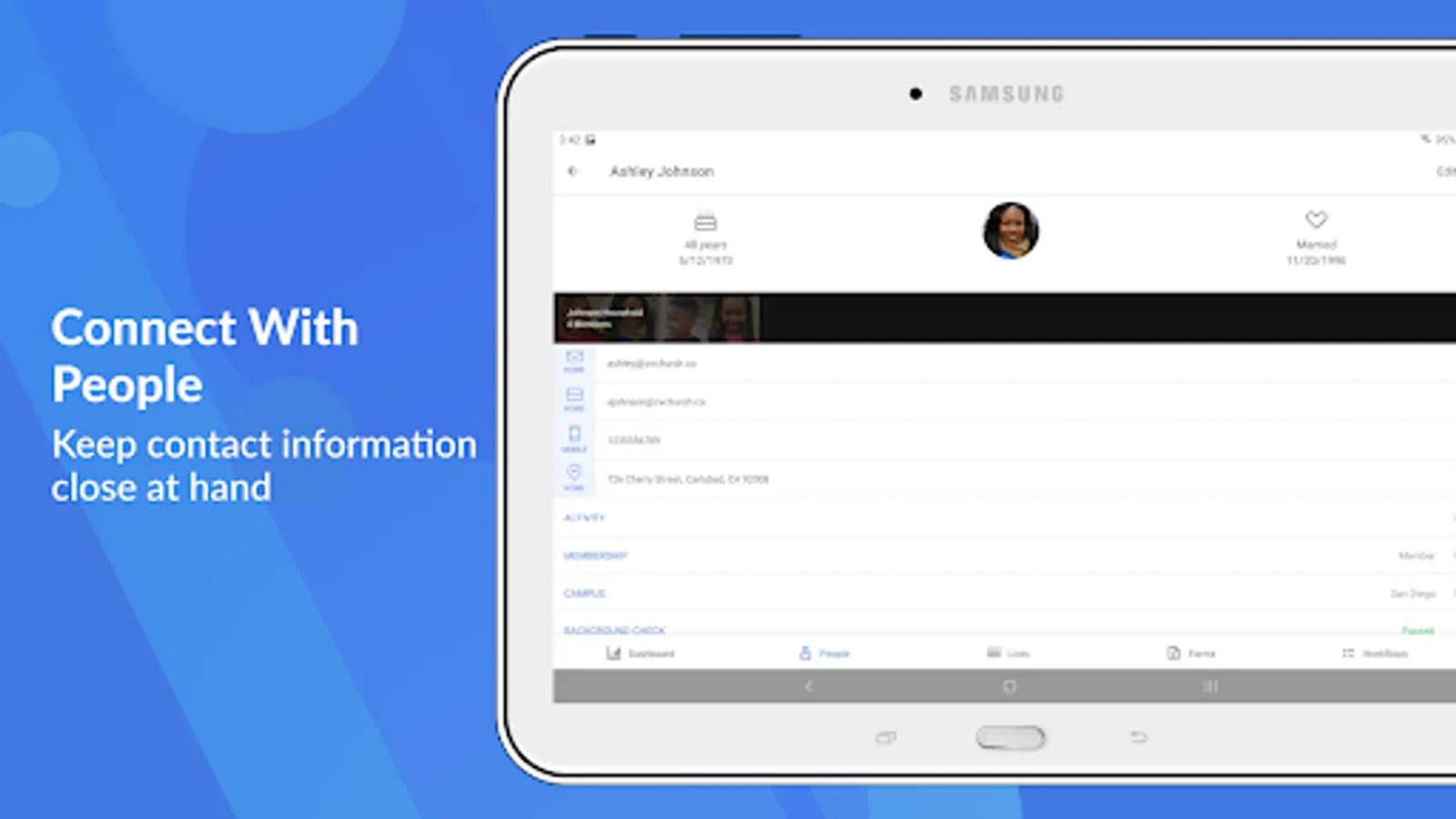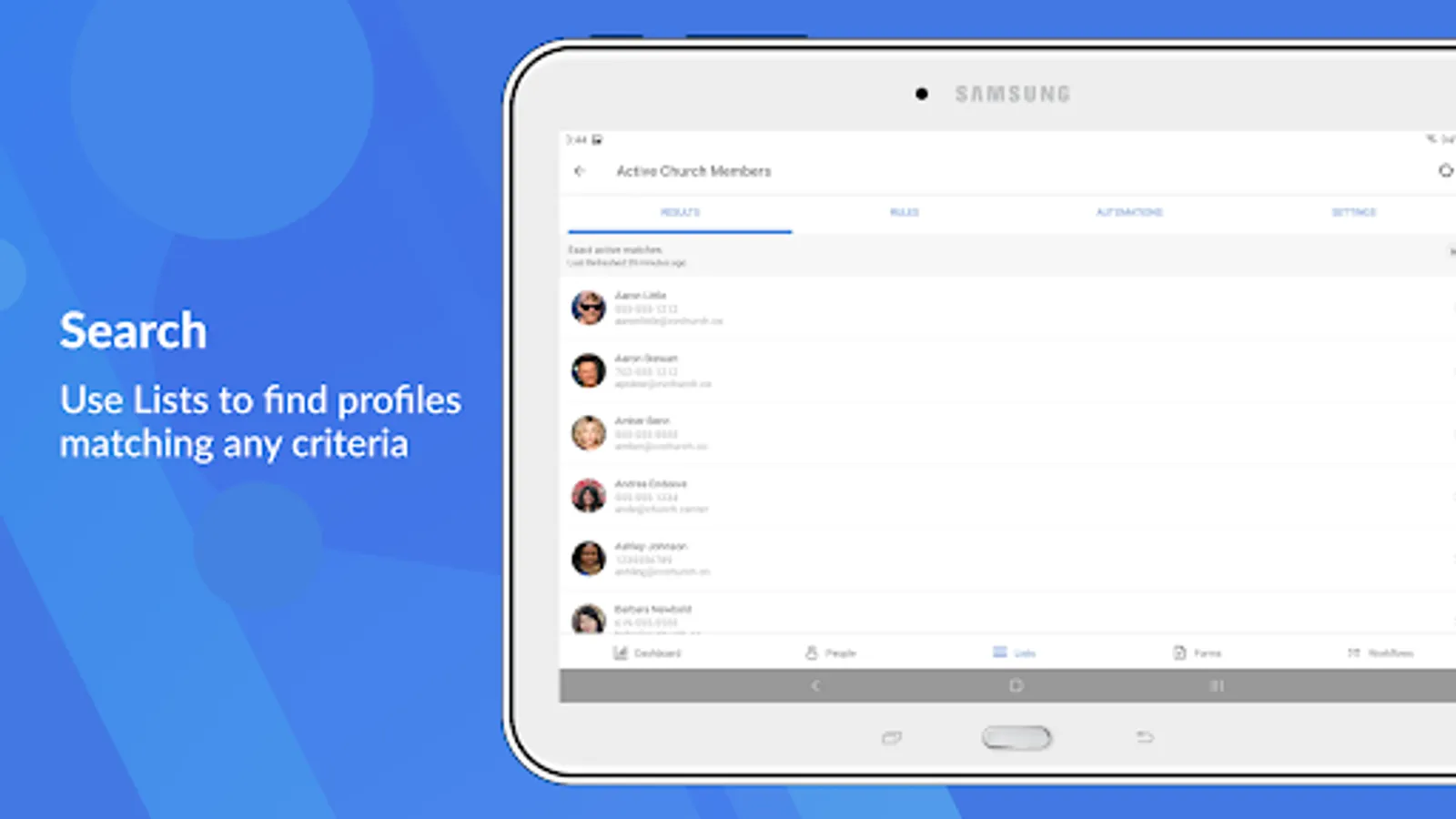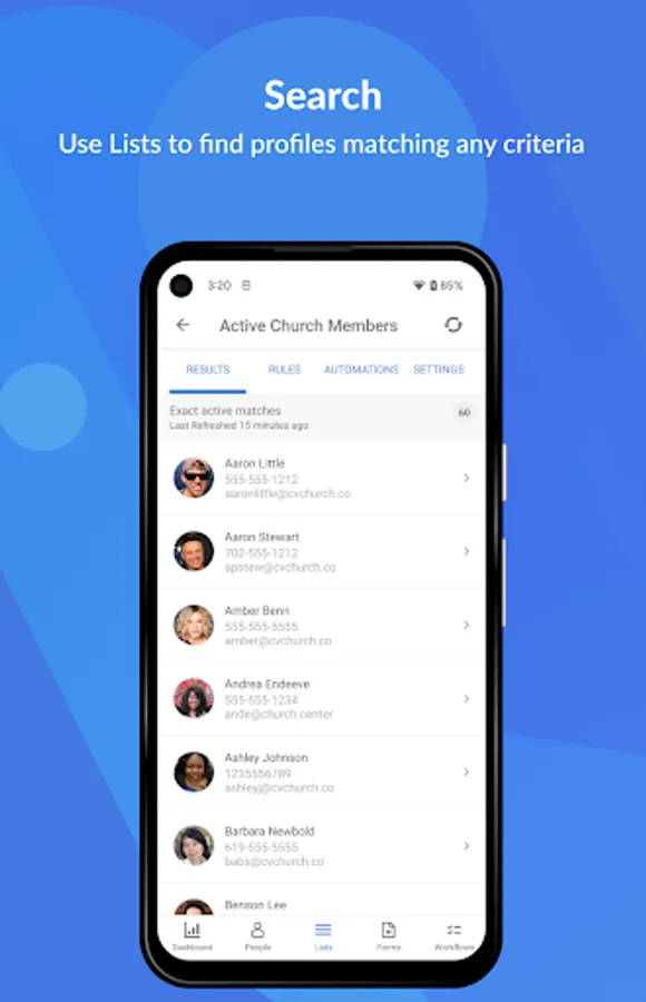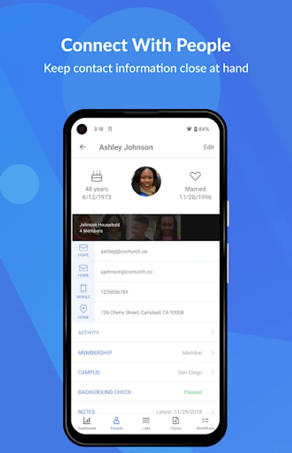 • View, create, and edit membership info and photos about the people in your church.