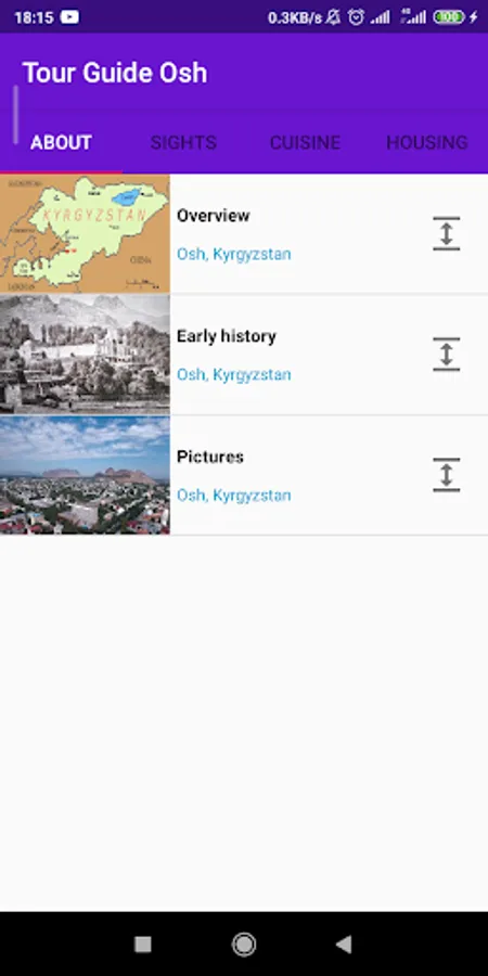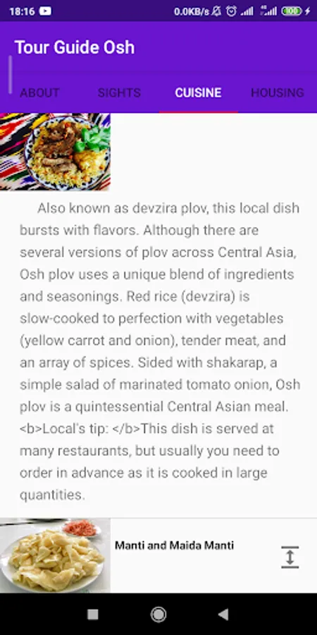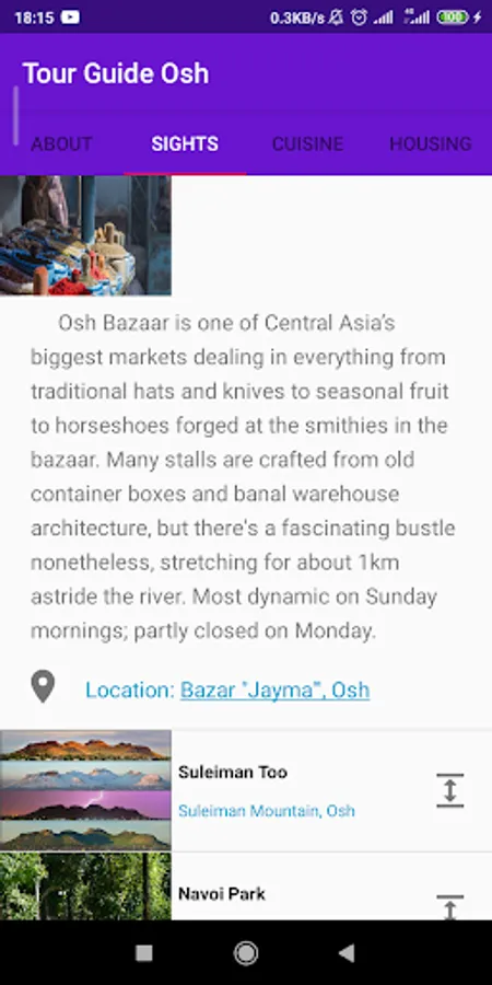 Simple Osh tour guide app for tourists. You can learn about the city's history, cuisine, hostels and look them up on Google Maps.