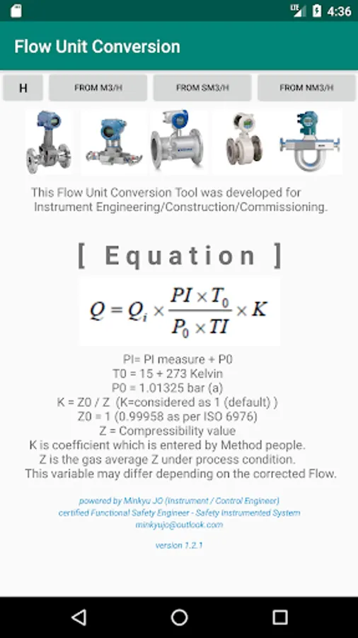 This application was made to facilitate the flow unit conversion between Actual flow rate (m3 / h) and Standard flow rate (Sm3 / h) or Normal flow rate (Nm3 / h).