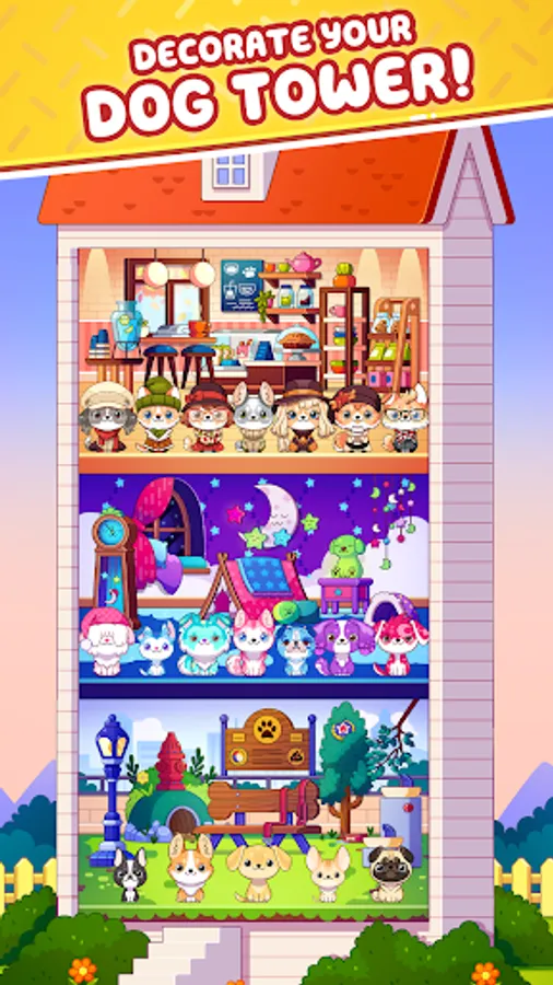 Collect adorable dogs like shiba inu, husky, pug, bulldog, golden retriever and beagle! Thereβs over 900 puppys you can collect! π« Decorate rooms in your dog towers with your favourite styles: unicorn, fancy, legendary, anime, magic and so many more!