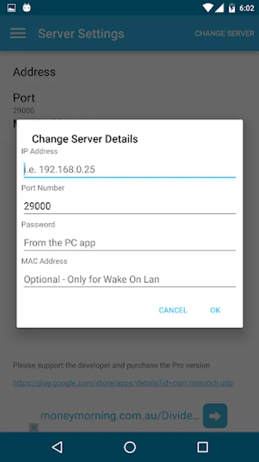 Please make sure you open port 29000 (UDP) (The port can be changed) on your PC (if you're running a firewall). If your wanting to use it over the Internet, I suggest you obtain a static IP Address or signup with noip.com (obviously port forwarding would be required)