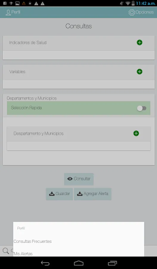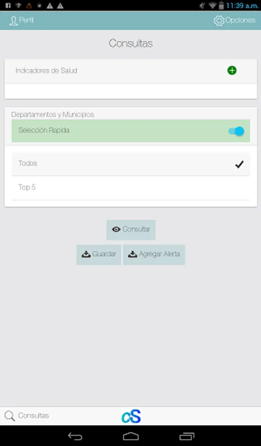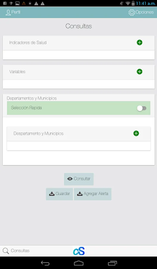 The mobile application will allow SaluDatos consult, compare and disseminate statistical data related to health in Colombia, where three main axes are used: health indicators, geography and location of disaggregation variables. The application will display the results in statistical charts such as bar, table data, trend lines.