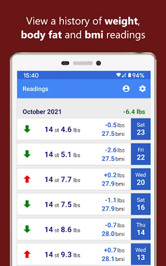 A quick and simple way to track your weight, BMI (body mass index) and body fat percentage.