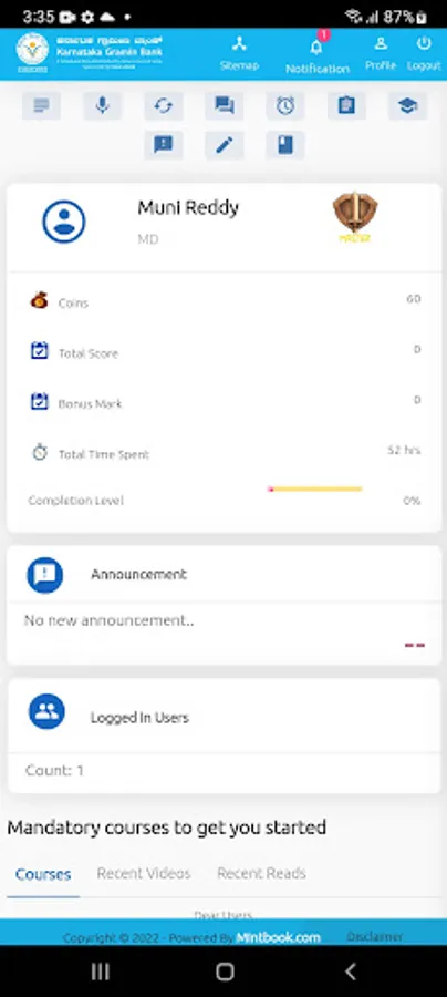 Karnataka Gramin Bank Learning Application - Contains Courses, Podcast, Study material, Forum, Quiz hour, Assessment, Certification, Query corner, Notes, Digital Library features.