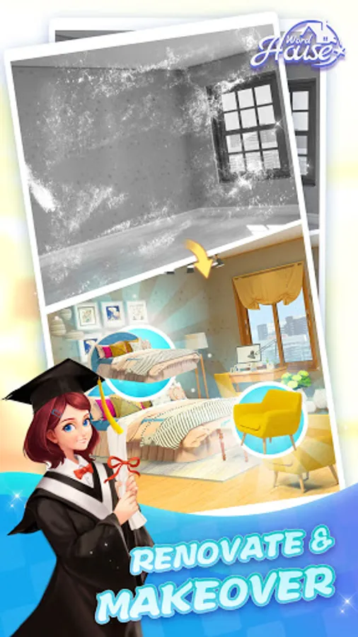 Become a house makeover expert and interior designer and solve fun word puzzles to win a wide variety of fabulous rewards! Passing the word levels to renovate all kinds of rooms and layout plans!