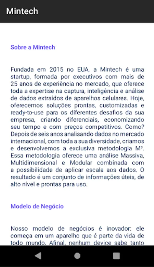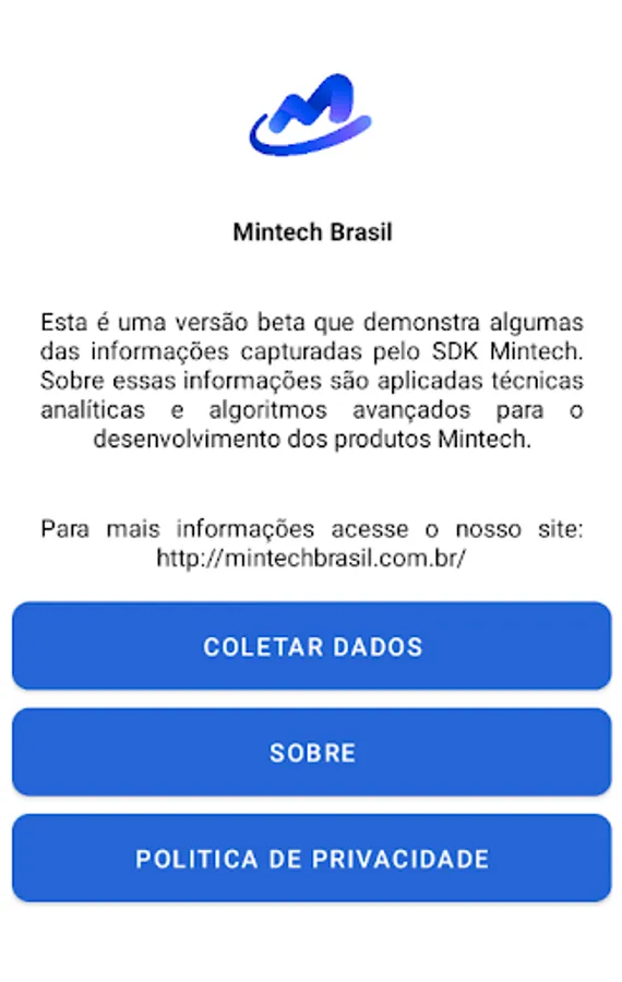 Esta é uma versão beta que demonstra algumas das informações capturadas pelo SDK Mintech. Sobre essas informações são aplicadas técnicas analíticas e algoritmos avançados para o desenvolvimento dos produtos Mintech.