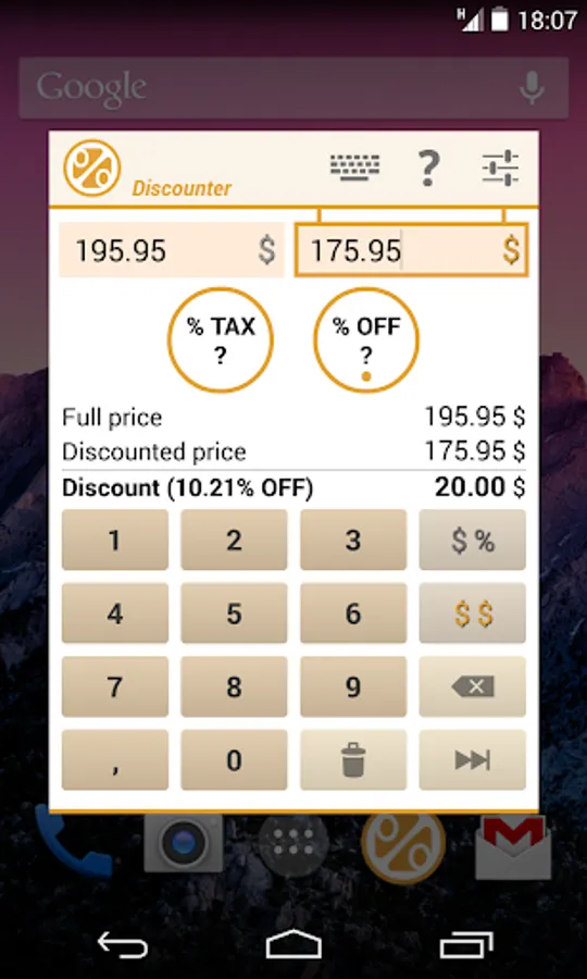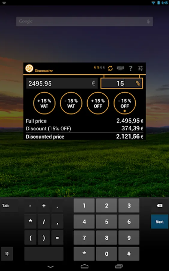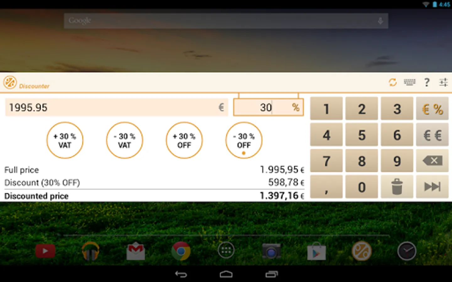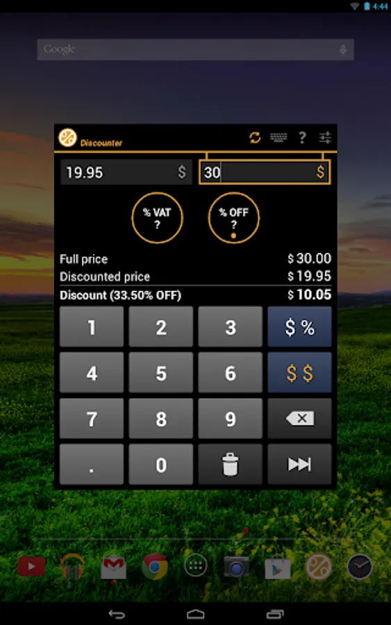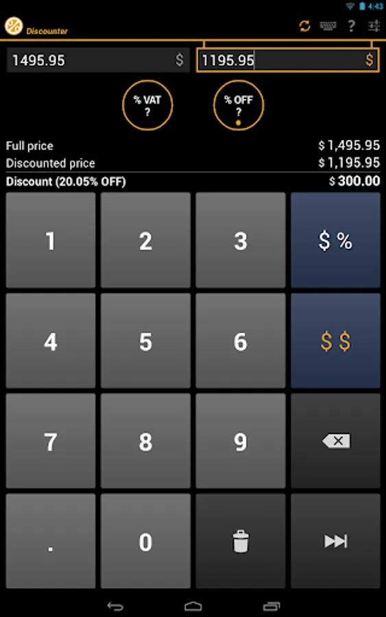 Calculator useful in rebates, deals, closeouts, clearing, sale, TAX free days, deduct VAT and more.