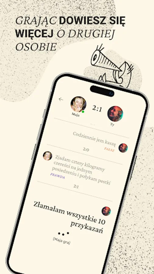 We will help you present yourself in an interesting way. By playing you will learn more about the person on the other side of the screen, after which you will start a conversation more gracefully! No more trivial pick-up lines.