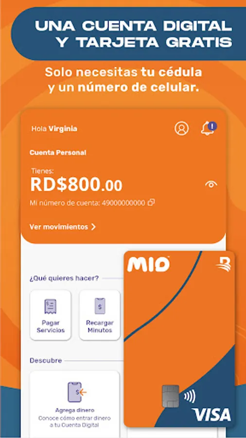 With MIO you can open an account in pesos from your cell phone or tablet, which allows you to send and receive money, pay for services, recharge minutes and save in a simple way. In addition, you will have a Visa payment credential to use the money in your account.