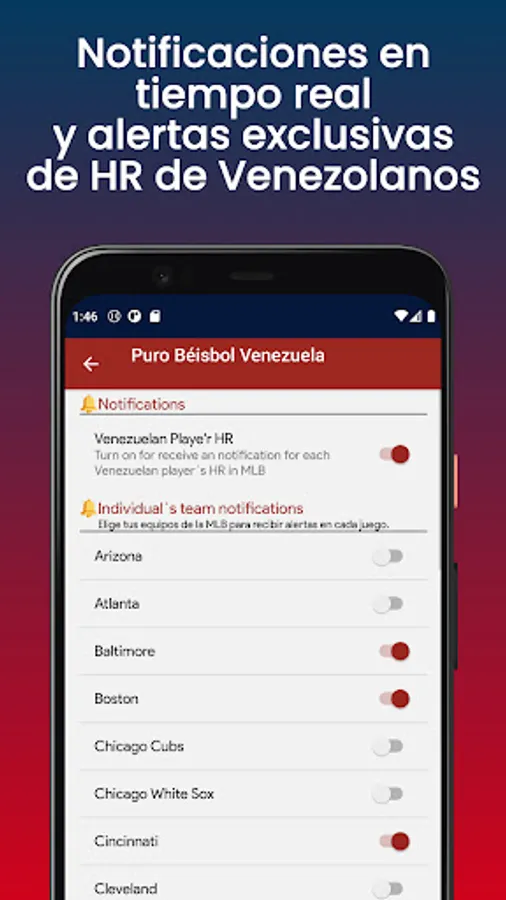 Mark your favorite teams in the settings of the app, both MLB and LVBP, and order the list of games starting with your favorite team, and if it wins, you will receive a personalized notification.