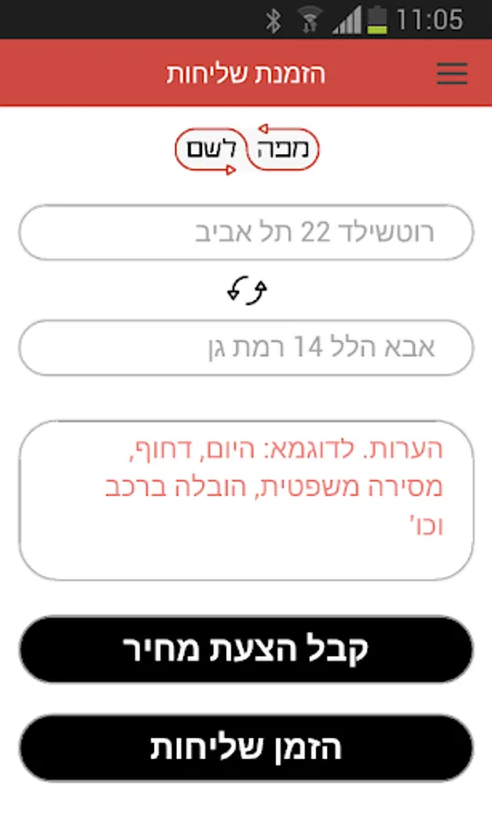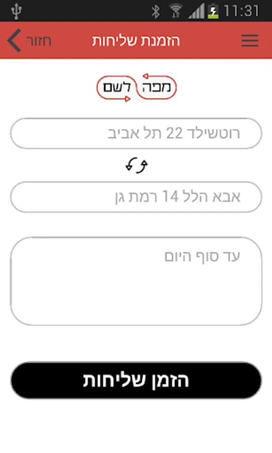 'Here to there' is an app for ordering errands and making real-time quotes independent envoys professional. The service is now active in the following areas: Tel Aviv, Ramat Gan, Givatayim, Ramat Hasharon, Herzliya, Kfar Shmaryahu Rishpon, Ra'anana, Kfar Saba, Hod Hasharon, Petah Tikva, Rosh, trouble, Bnei Zion, Kfar Yona, Netanya and all communities in these.