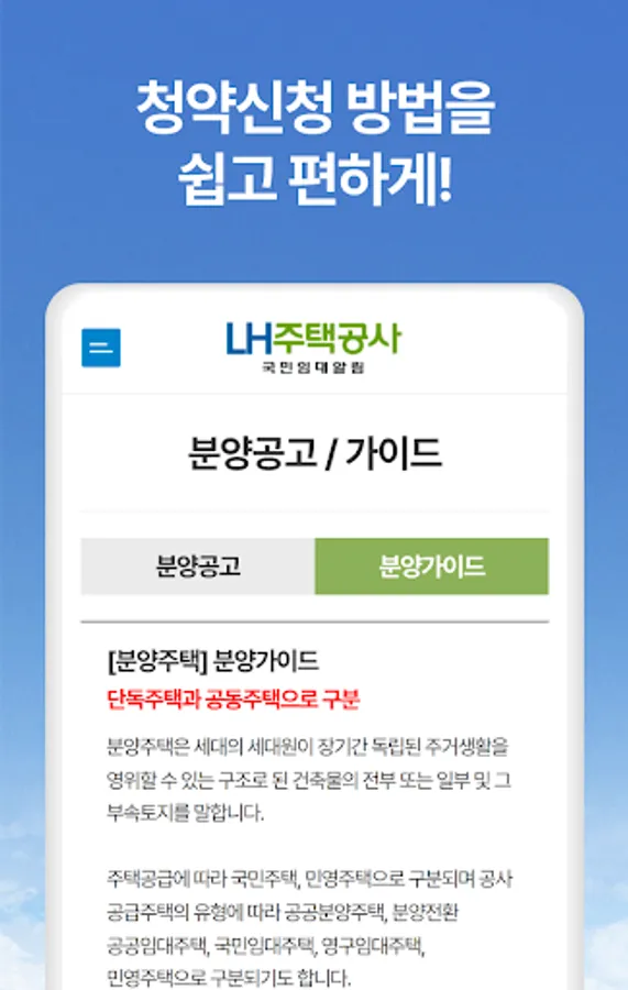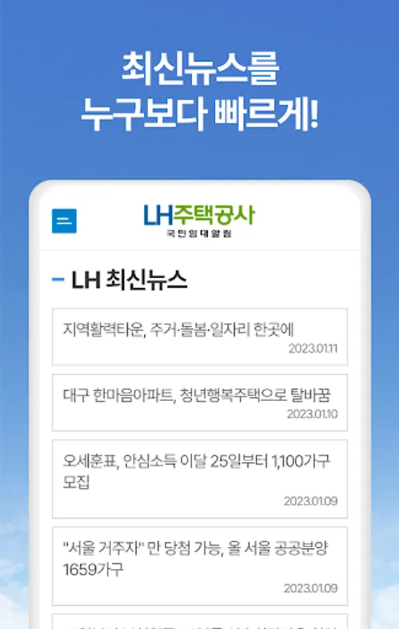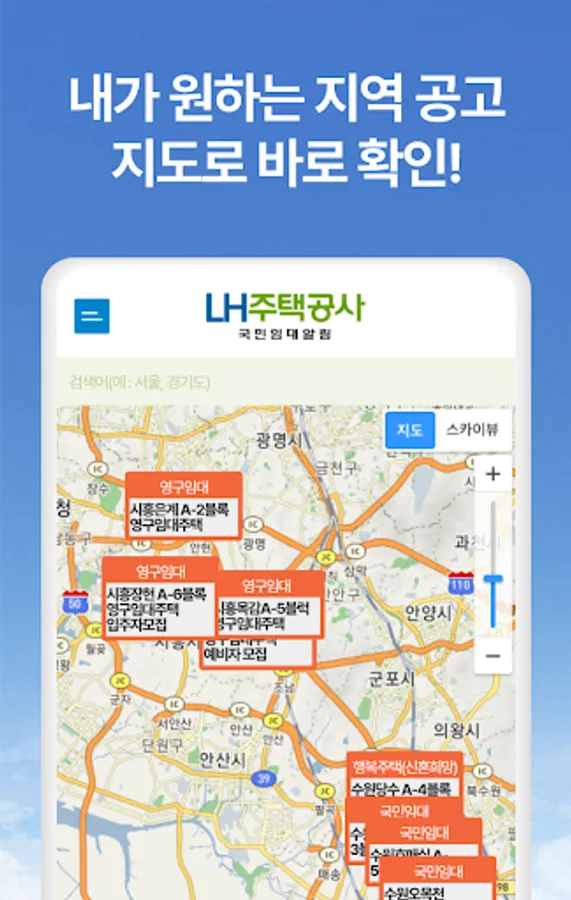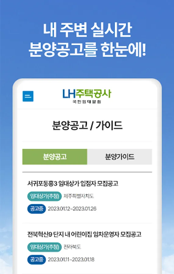 You can easily check the sales news provided by LH Housing Corporation in 2023 with a nationwide map. Check the announcement news in the area you are interested in through real-time local announcement notifications, and easily find out information such as national rental, national rental apartment, permanent rental, and SH sales of LH Housing Corporation. We provide an easy-to-understand and organized sales guide to help you apply for sales conditions and procedures.