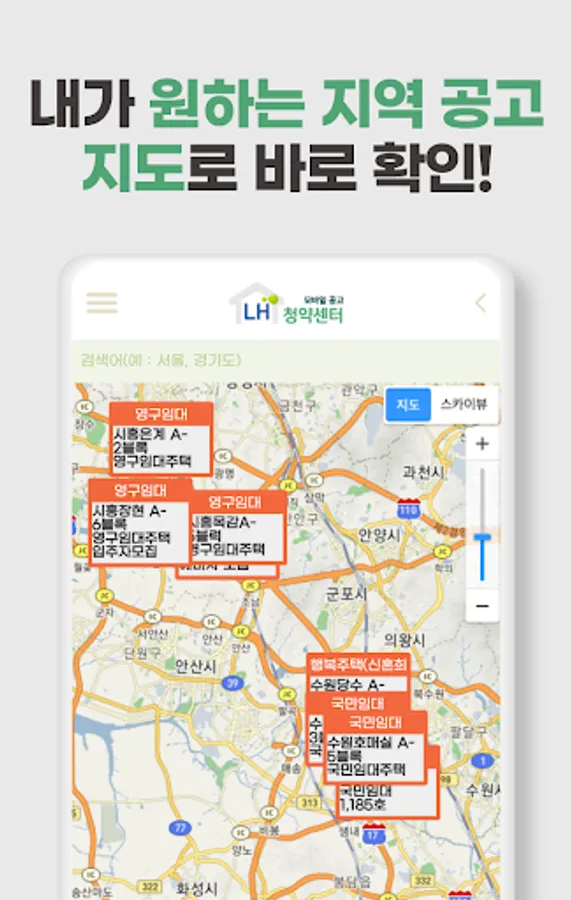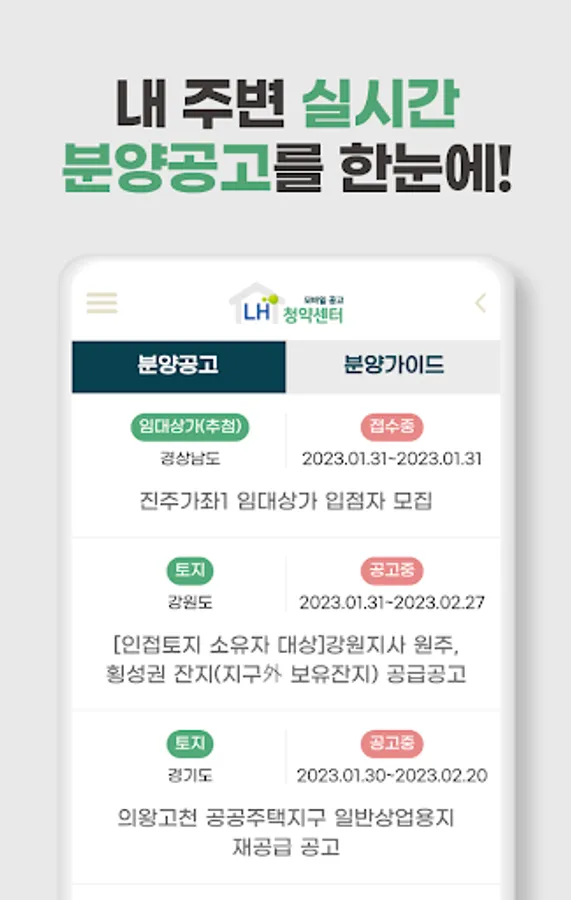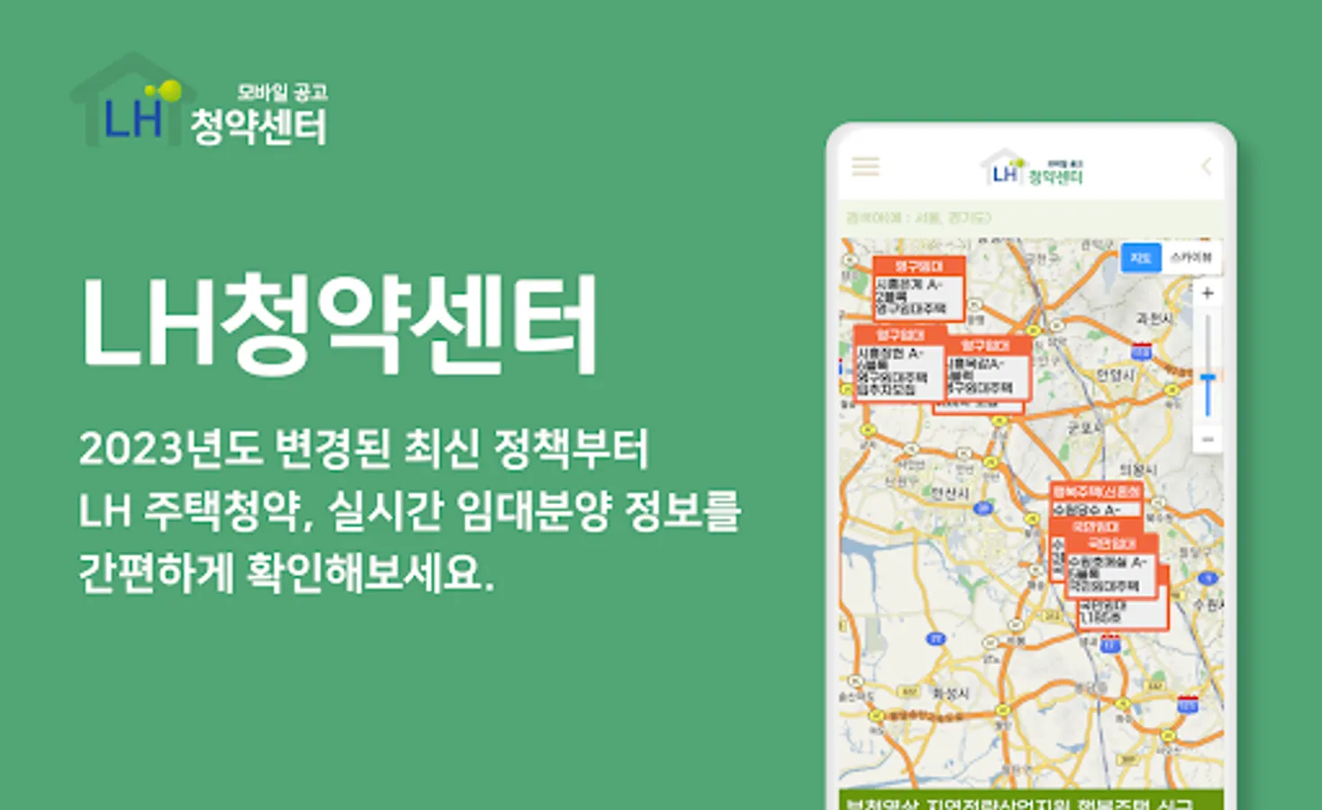 You can check the LH sales announcement news at a glance with the nationwide map provided by the LH Subscription Center mobile announcement app. Check out the LH Housing Corporation's sales announcements and news, such as National Lease and Happy Housing, and various information on SH subscriptions in the LH Subscription Center mobile announcement app. You can quickly meet real estate policies and the latest LH news that change in 2023 through push notifications provided by the LH subscription center!