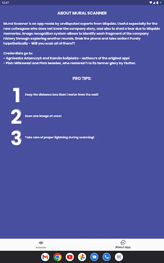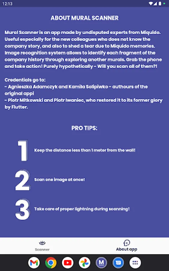 Mural Scanner is especially useful for new teammates, Miquido's guests or anyone who wants to know the company's history. The image recognition system allows the identification of each fragment of the company's history by discovering subsequent murals. So: take your phone, and get ready to explore the brightest and the darkest Miquido secrets hidden in our kitchen wall! Will you uncover them all?