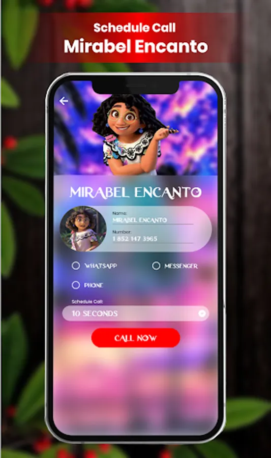 Simulate unlimited prank calls or set custom timer for the incoming fake call for Mirabel. The schedule prank call is with the timer to receive Encanto Bruno or Mirabel video call by fake caller id. The fake call app contains a set of real prank voices of Mirabel Encanto just pick one of them and make a caller answering from the other end.