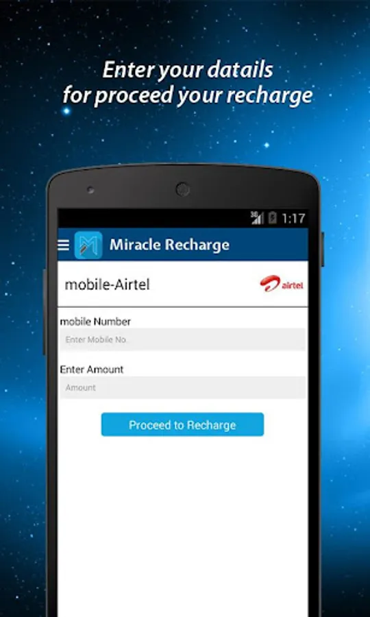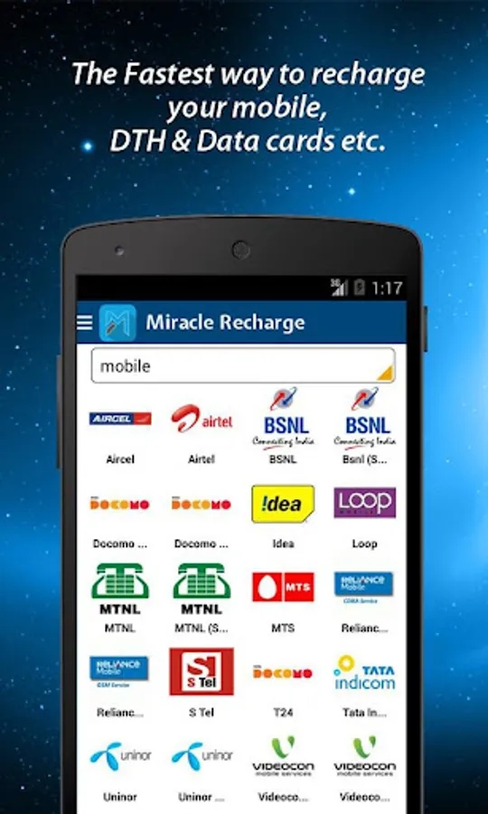 Miracle Recharge is one of it's kind single point mobile top up and recharge service platform. We offer simple and Fast And Quick mobile recharge facility for All cellular services like Airtel, Bsnl, Aircel, Idea, Reliance CDMA, Reliance GSM, Virgin, MTS, TATA Indicom,Vodafone and TATA DOCOMO. DTH recharge service is provided by us like Reliance Big TV, Dish TV, Sun TV,Sun Direct,Videocon D2H and Tata Sky. While our Data card service covers the Big players like Aircel, BSNL, Idea, MTS, Reliance and Tata.