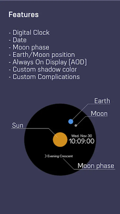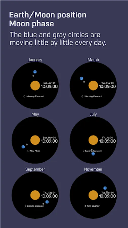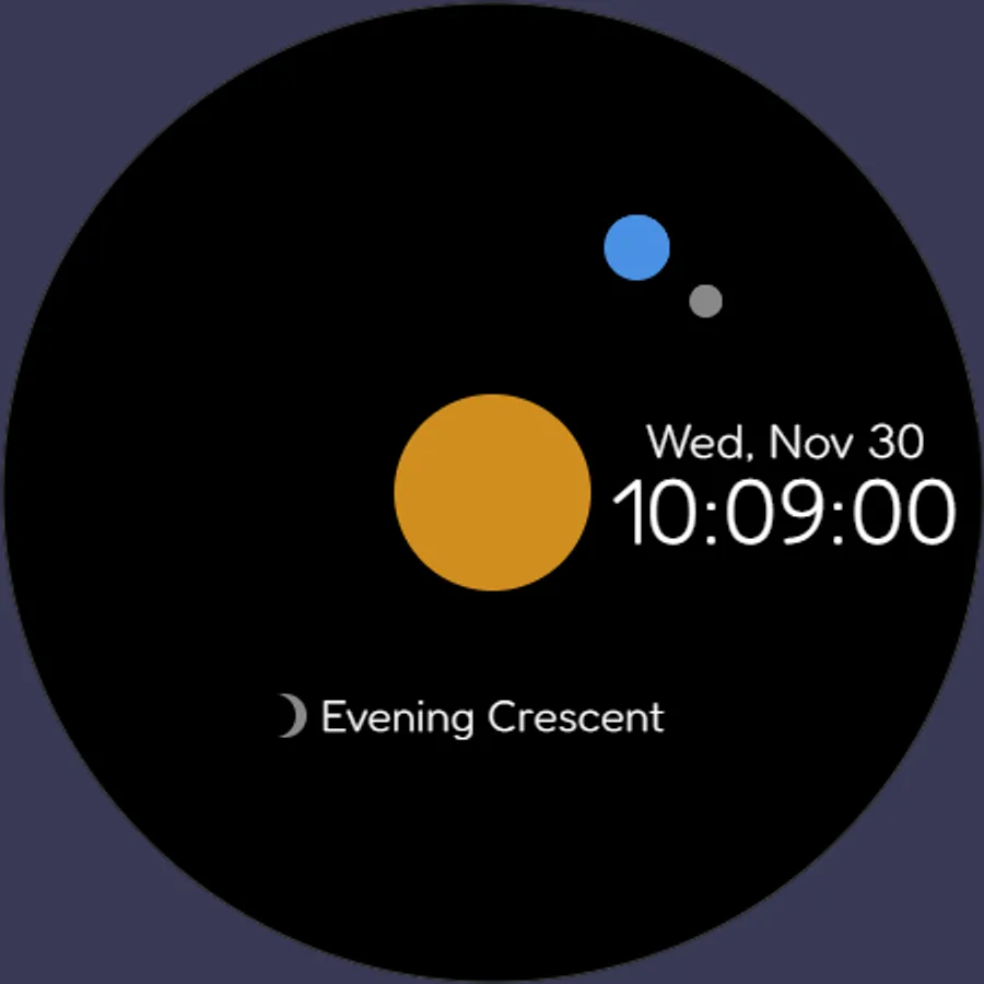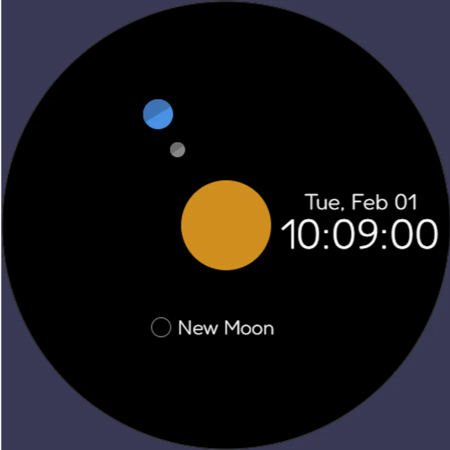 A minimal and simple digital watch face that allows you to roughly grasp the position of the sun, earth and moon.