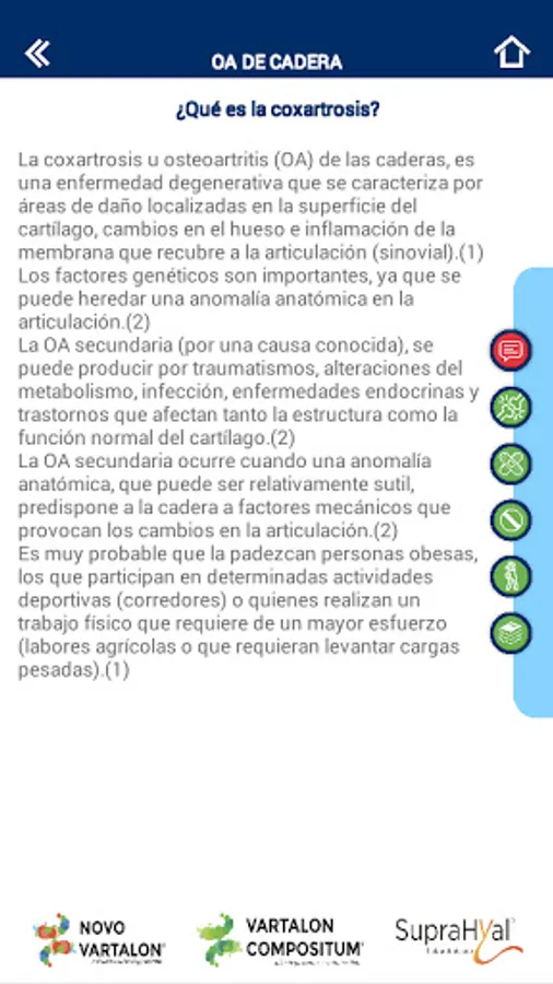 Application with audiovisual content and summaries of publications, created by specialists with the aim of increasing knowledge about Osteoarthritis in different joints (hip, knee, spine, hand and shoulder). In addition, it has information related to the disease in the designated joint and the treatment options that can be administered.
