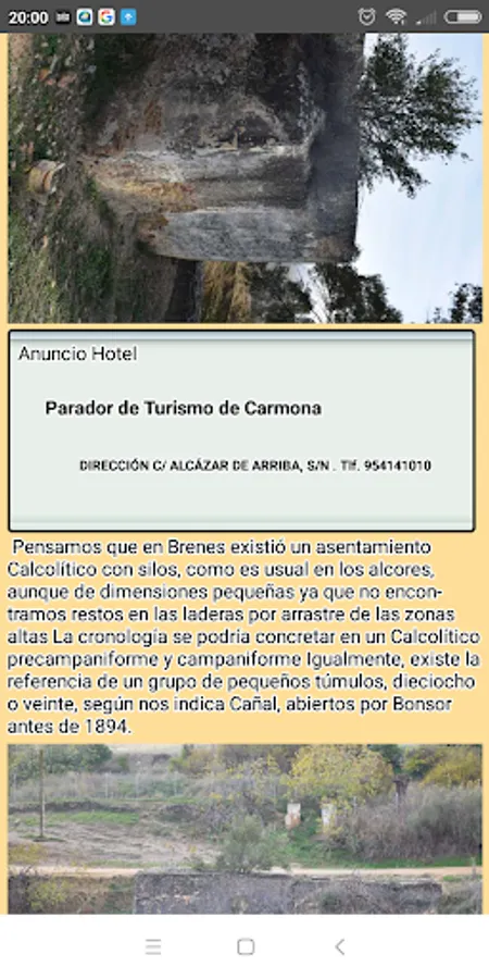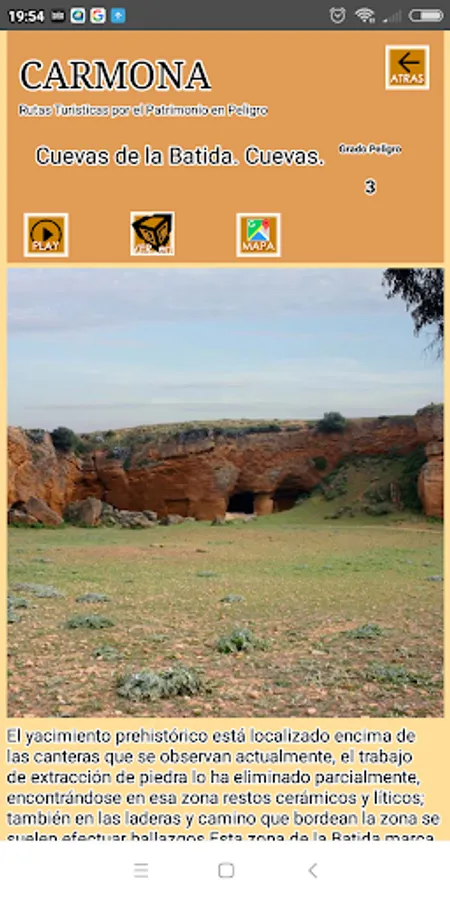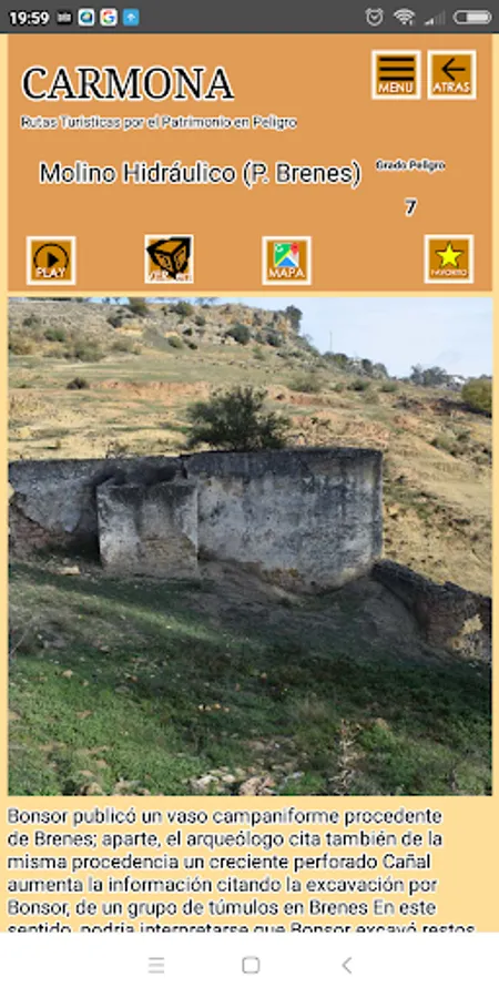 This application is the result of the work of members of the Heritage Defense Association Luis Reyes "Calabazo" of Carmona. In it we collect the monuments and archaeological sites that are currently in danger in the municipality of the City of Carmona, Seville. With this application, the association intends to inform the citizens of the state of some of these heritage sites that due to neglect, neglect or negligence are in danger of suffering irreparable damage that may lead to their disappearance or deterioration. That is why this compilation is intended to be a still image of the current moment and the state of these places, so that we conscientiously not lose this legacy of the past for future generations. We have done it with the best of our intentions and we hope that our objectives are understood, which are nothing more than the defense of what we believe to be the heritage of all.