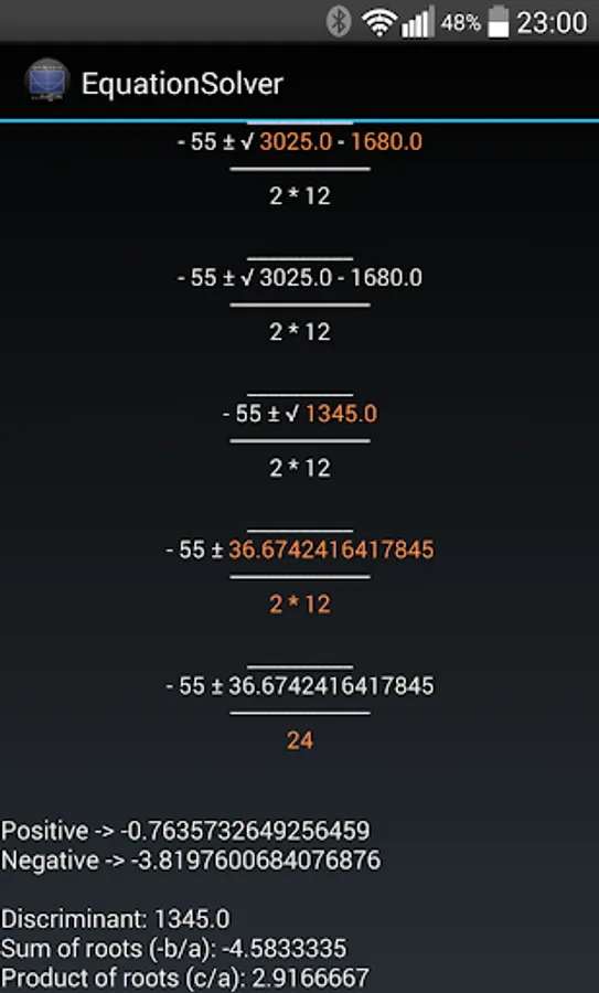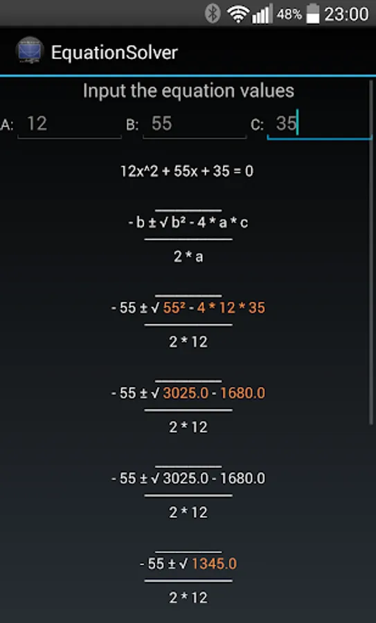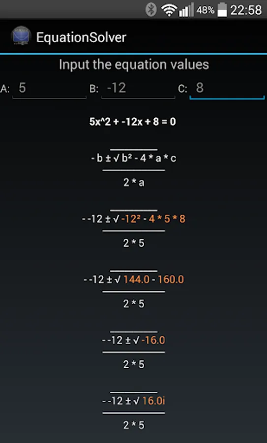 This application allows you to solve any quadratic equation. Just input the numbers and it will resolve it for you.