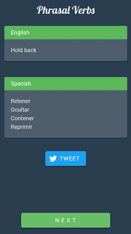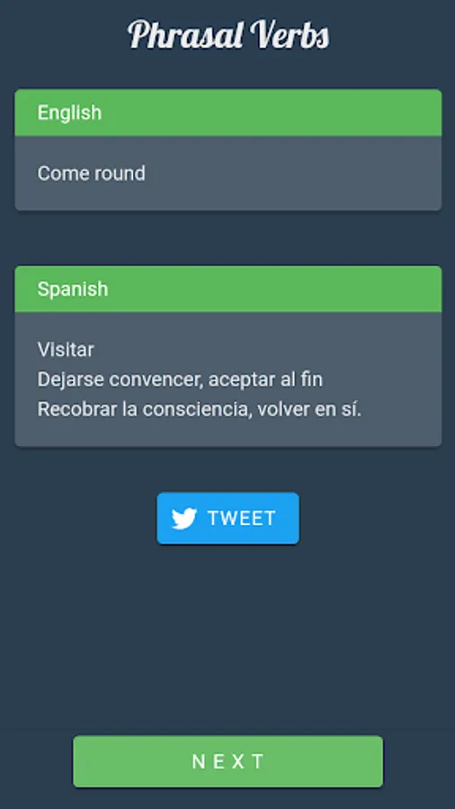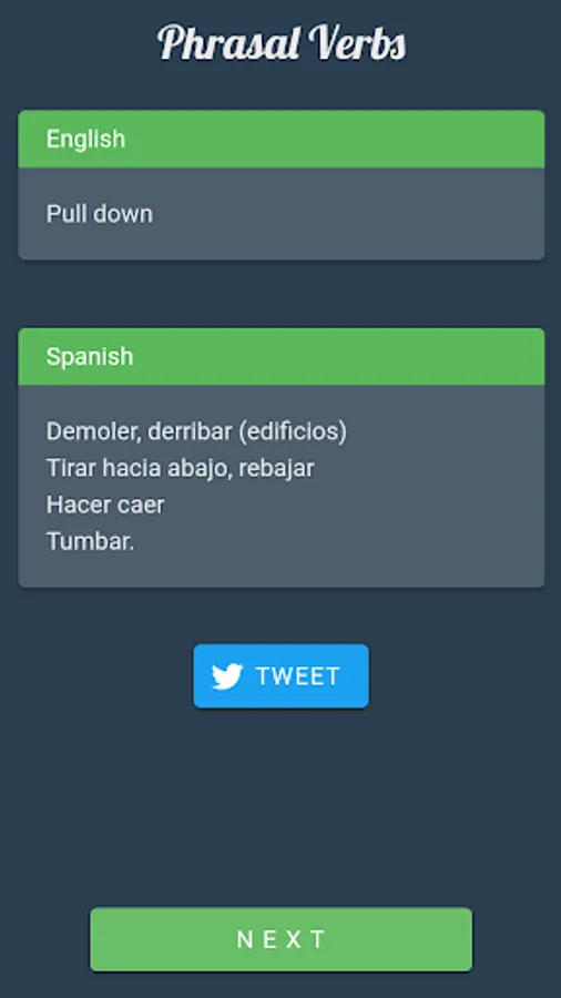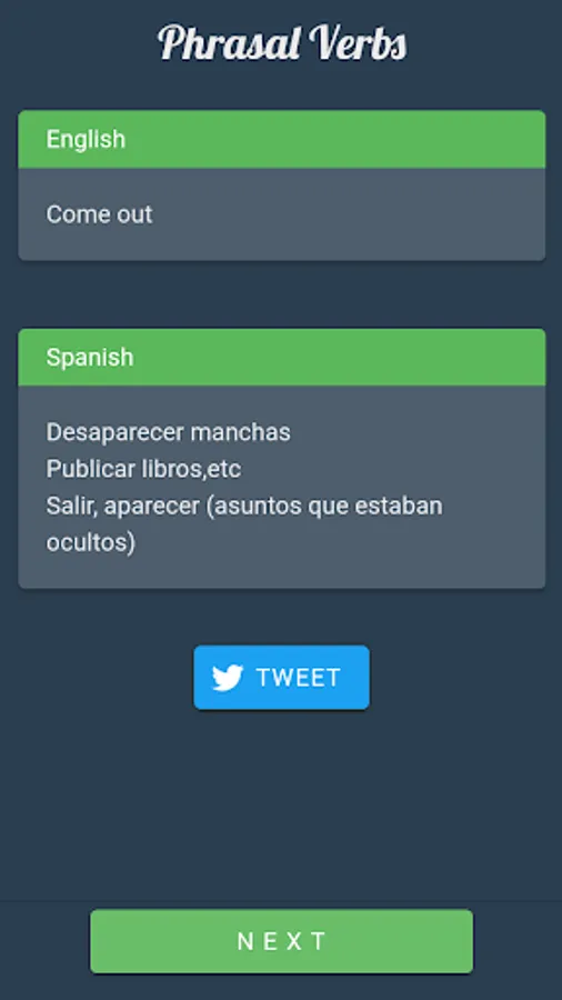 Learn English and Spanish phrasal verbs with this app. Either if you are learning English or Spanish in an intermediate or advanced level, this application will teach you the meaning of the phrasal verbs used in both language in a daily basis. It will appear on the screen the different phrasal verbs translated in both languages. There are more than 700 phrasal verbs that you could learn.