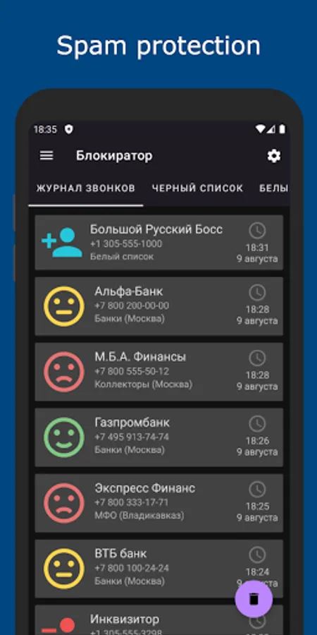 Get rid of unwanted calls from collectors, banks, microfinance organizations and other spam once and for good. The blocker will protect you from unwanted calls. You can fine-tune the level of protection to suit your needs, from simple notification of unwanted calls to complete blocking. Safe and completely free.