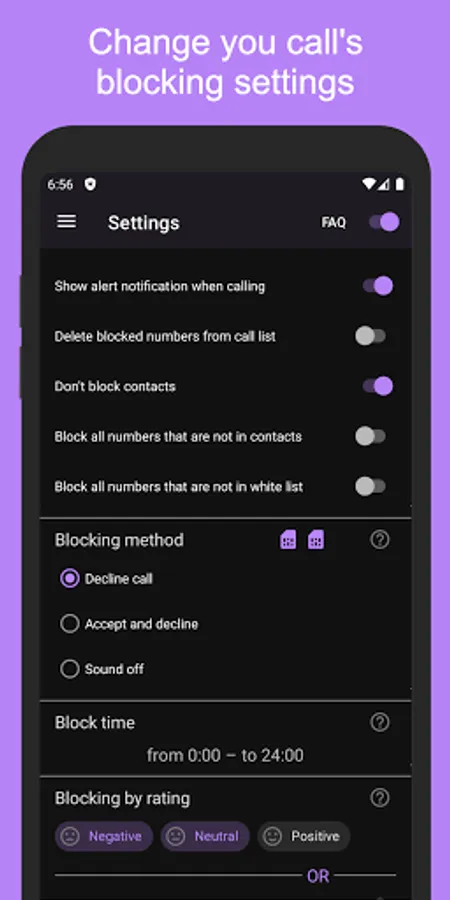 - Ability to change the blocking method: drop the call, mute, accept and reset.